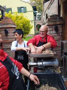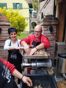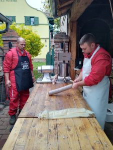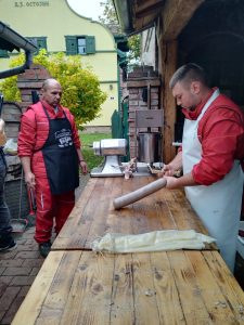 – Kada sve dobro izmešamo, pustimo desetak do dvadeset minuta da odleži, zatim meljemo. U samlevenu smesu dodamo malo vode od kuvanja, sve to ide otprilike, pravi majstor zna kad je dovoljno. Kada sameljemo stavljamo u mašinu za punjenje i punimo u creva. Nekada su se koristila svinjska creva, a mi smo za ovu priliku kupili creva za punjenje – rekao je Marković dok je nadgledao kako ide punjenje i vezivanje ovih, za Stajićevo karakterističnih, kobasica.