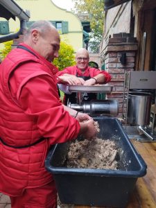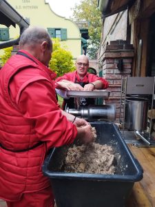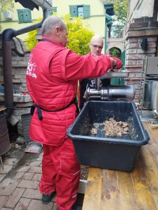 – Kada se sve skuva, odvaja se od kostiju i stavlja u posudu u koju se sjedini za začinima. Od začina idu klasično so, biber i beli luk. Može se ići po ukusu, ali ide i na procenat začinjavanje, zavisi od količine i kako ko voli. Ovo što mi pravimo ne ide na barenje i ne ide na procenat, kad ide na barenje onda može da se stavi malo više soli. Ide 2 posto soli na ovu količinu koju mi imamo, nekih desetak kg – objasnio je majstor Goran Marković iz Stajićeva, napomenuvši da je najbitnije sve dobro izmešati pre mlevenja, kako bi se začini i smesa dobro sjedinili.