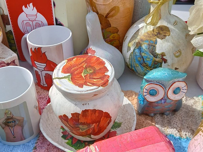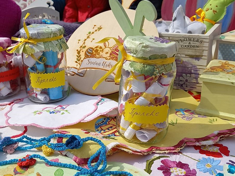 Tako su se na tezgama našli ručno rađeni sapuni, šivene kecelje, oslikane tikve, igračke, heklana i vezena odeća, „tegle sreće“ sa ispisanim porukama. Ovi proizvodi pomažu članovima udruženja da provedu kvalitetno vreme, ali i da zarade malo novca.
