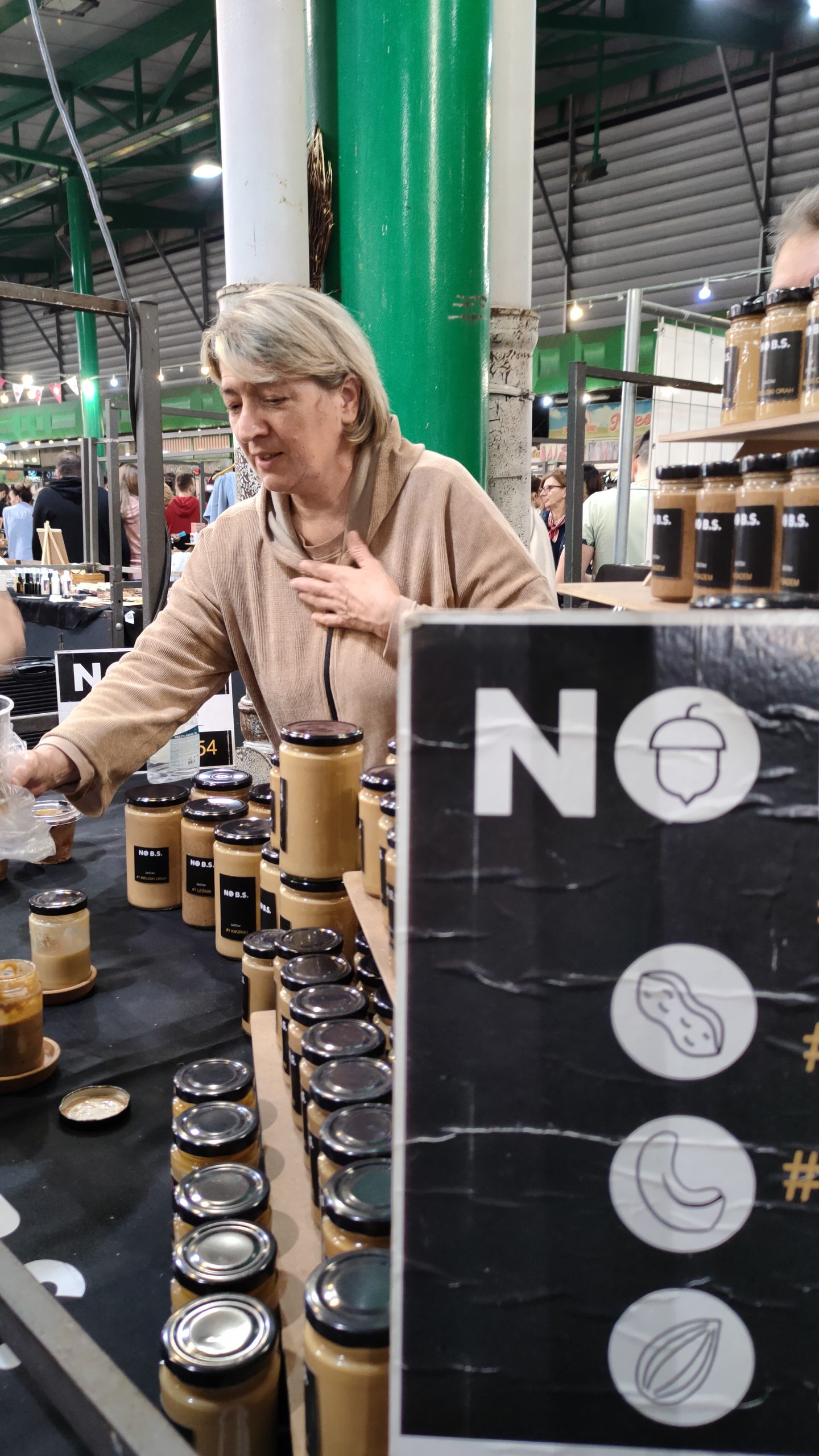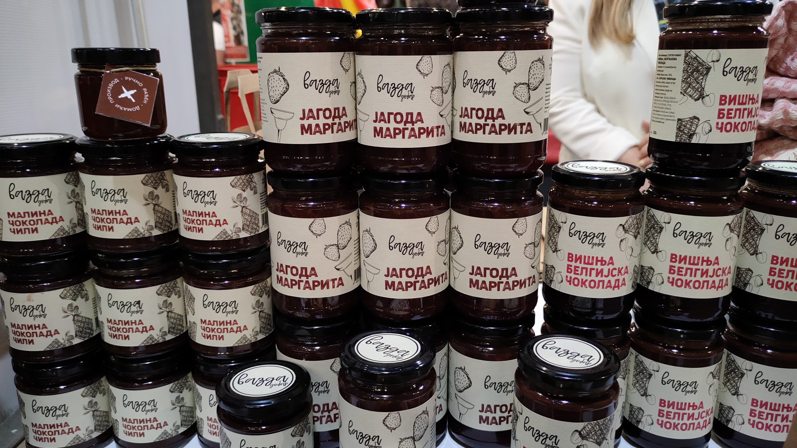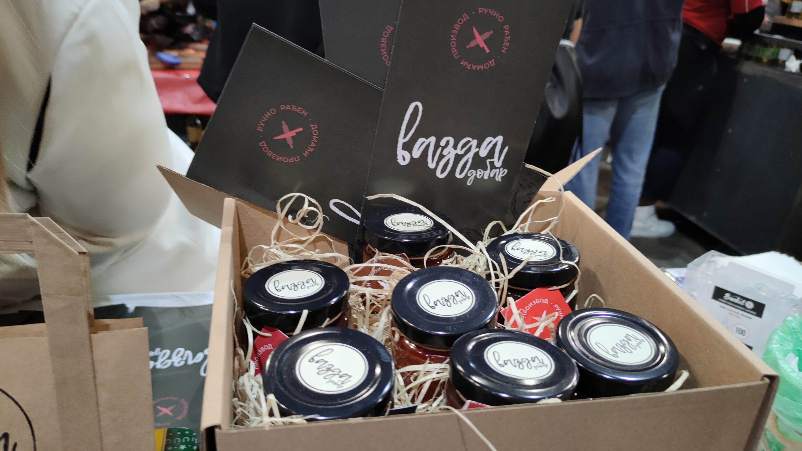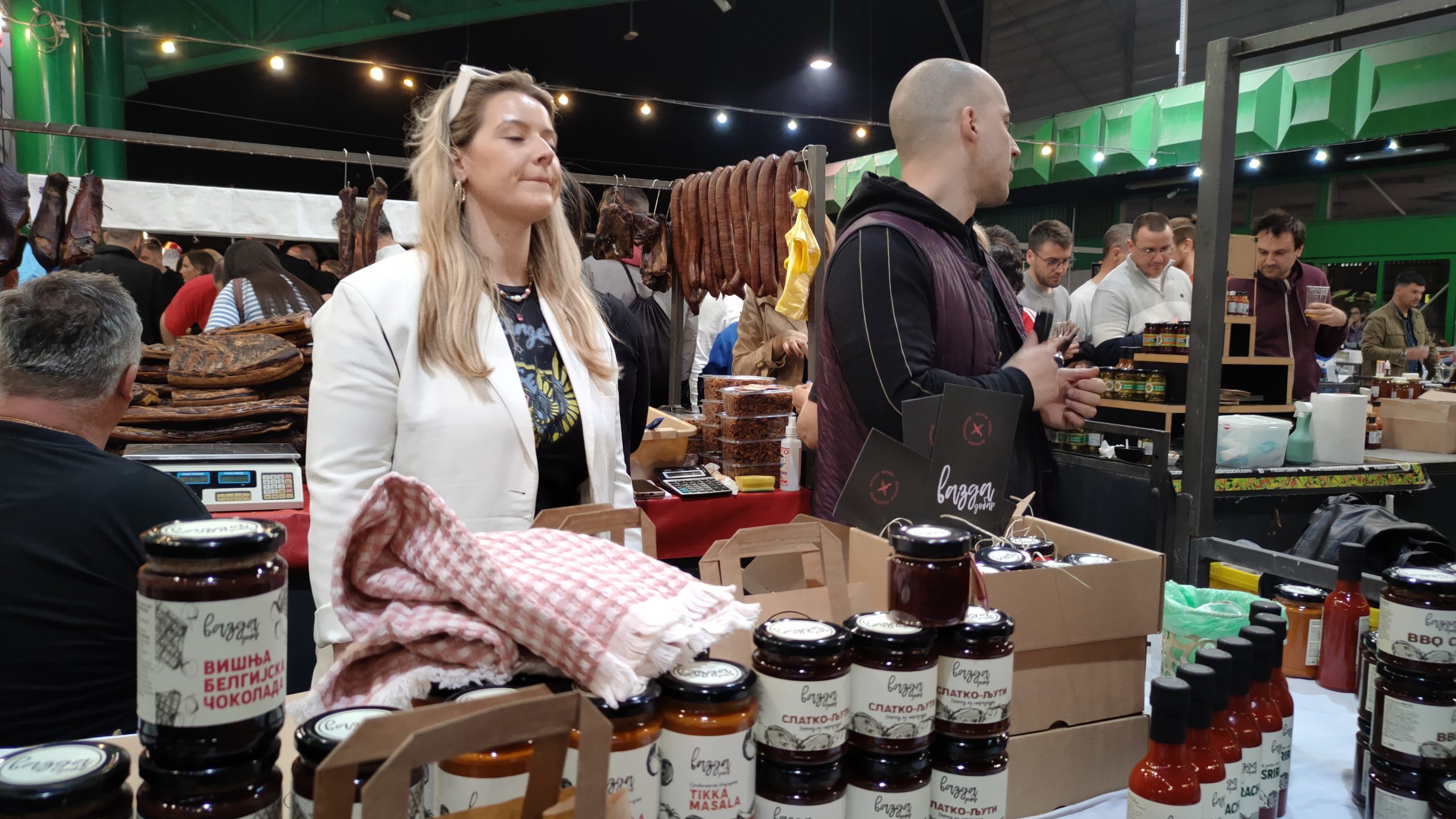 – Probajte domaće paštete, nećete se pokajati, ovakve niste do sada probali – poziva Marko Vasiljević, vadeći jednu po jednu teglicu i nudeći potencijalnim kupcima. Na suprotnoj strani, ko uspe da se probije, nailazi se na sušeni paradajz u maslinovom ulju, kao i sečeni sušeni paradajz, i pesto od paradajza. Ne zna se šta je ukusnije i lepše pakovano. Tu odmah do njih, sušeno meso, slanina – ona mesnata dobro suva, kobasice, sapunjara isto dobro suva, taman čovek da spoji sve i dobro zamezi. Pored već pomenutih francuskih sireva, bila je tu i sada već među ljubiteljima noćnih bazara i domaćih proizvoda, omiljena Mira Gilić sa svojim „Butikom kačkavalja“.