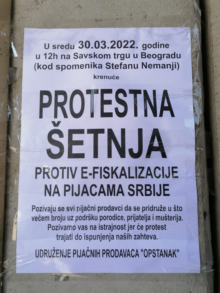 Udruženje pijačnih prodavaca „Opstanak“ najavljuje protestnu šetnju, koja će se održati prekosutra, u sredu, 30. marta, u Beogradu, zbog obavezne