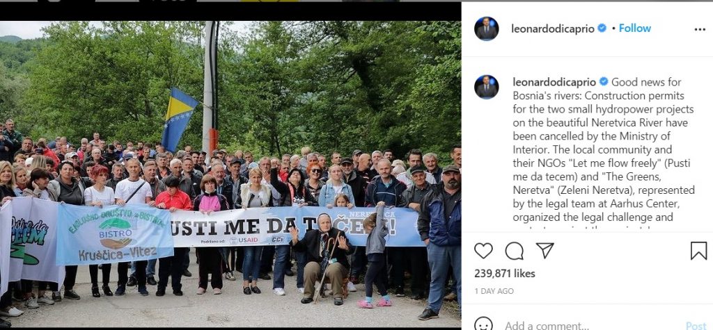 Glumac Leonardo Dikaprio je na svom Instagram profilu ponovo pokazao da pomno prati borbu za reke u Bosni i Hercegovini,