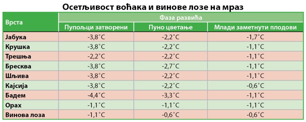 Obratite pažnju na temperature izmrzavanja voća, kako biste na vreme mogli da reagujete bilo antifrost sistemom, bilo toplotnom zaštitom u