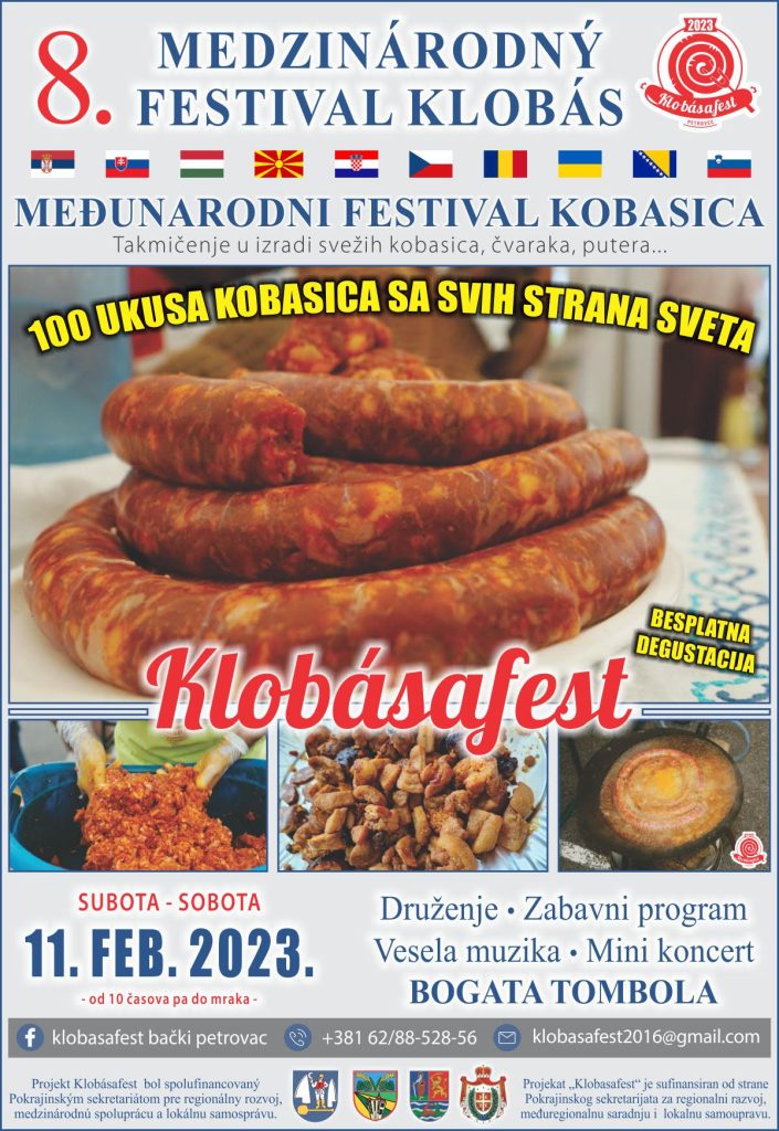 Udruženje Klobasfest iz Bačkog Petrovca poziva građane i ljubitelje ovog specijaliteta na 8. Međunarodni festival kobasica Klobásafest 2023. Festival će