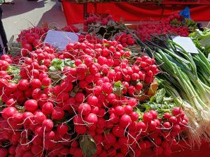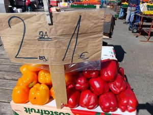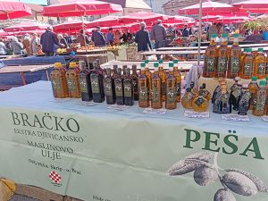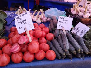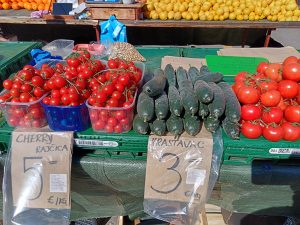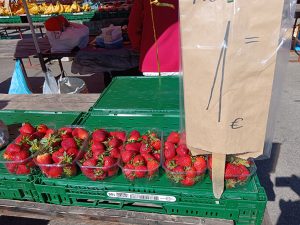 Na prvi pogled ima za svakoga po nešto. Namirnice izgledaju sveže i ukusno. Moramo da primetimo da su proizvodi nižih cena nego u Beogradu. Na jednom mestu si se našli mladi krompirići, zelena salata, mladi beli i crni luk, velike crvene paprike, čeri paradajz, sveži krastavci, tikvice, bundeve, rotkvice, začinski zeleniš… Od voća osim standardnih pomorandži, limuna, banana, ananasa, manga, bile su tu i ovogodišnje sezonske jagode. Ljudi su osim maslinovog ulja koje se prodavalo u flašama, bili zainteresovani i za vezice maslina. Kao i kod naših prodavaca, moglo se cenjkati, a pri tome i ispričati o svemu i svačemu sa raspoloženim i pričljivim prodavcima.
