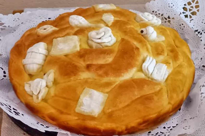 Od jednog dela napraviti okruglu pogaču, a od drugog pletenice ili spirale, koje se stavljalju po obodu pogače. Utisnuti paricu i testo premazati umućnim belancetom. Ostaviti na toplom mestu da još jednom nadođe i peći u zagrejanoj rerni, najpre 15 minuta na 200 stepeni, a onda još toliko na 180 stepeni.