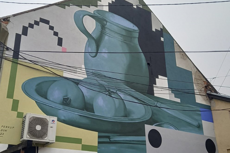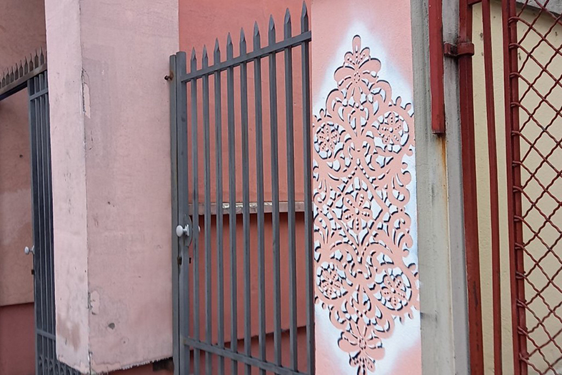 Tako je na zgradi u Rajićevoj ulici osvanula nežna, bela čipka na pozadini boje terakote. Cela fasada izgleda kao da je baka ovog jutra stavila svoj novi, poštirkan stoljnjak na sto pred važnu svečanost ili praznik. A preko puta te kuće, na betonskom stubu od kapije, prenet je motiv sa omanjeg heklanog miljea.