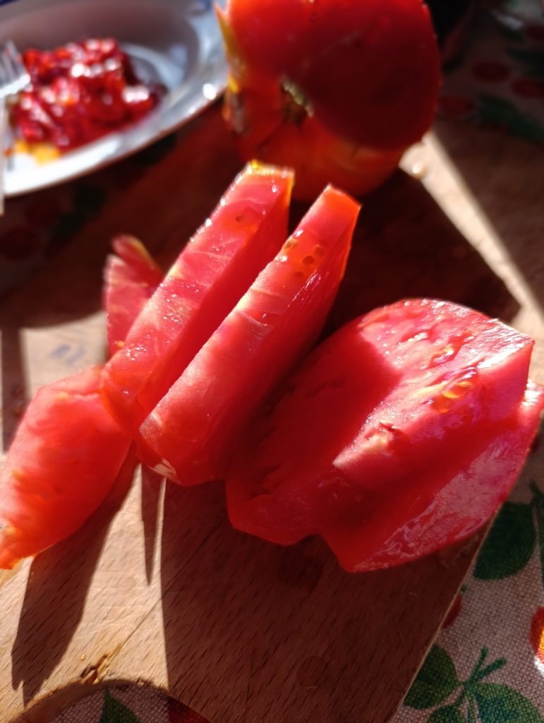 Pogledam kroz prozor, još se rosa nije digla. Neka lagana izmaglica treperi po selu. Hladno je, tek se malo iznad nule popelo. Ni ne izlazi mi se iz kuće. Al’ zove popadija na prvu jutarnju kafu. Pre kafe doručak. Pravi seoski. Jaja, sir, paradajz volujsko srce iz Milenine bašte. Neprskan. Dok ga sečeš on miriše kao što je nekad mirisao kad smo ga iz bašče brali, trljnuli malo dlanom i jeli ko jabuku. Vrati ti sva sećanja, sve ukuse detinjstva. Čini mi se godinama nisam ništa slađe pojela.