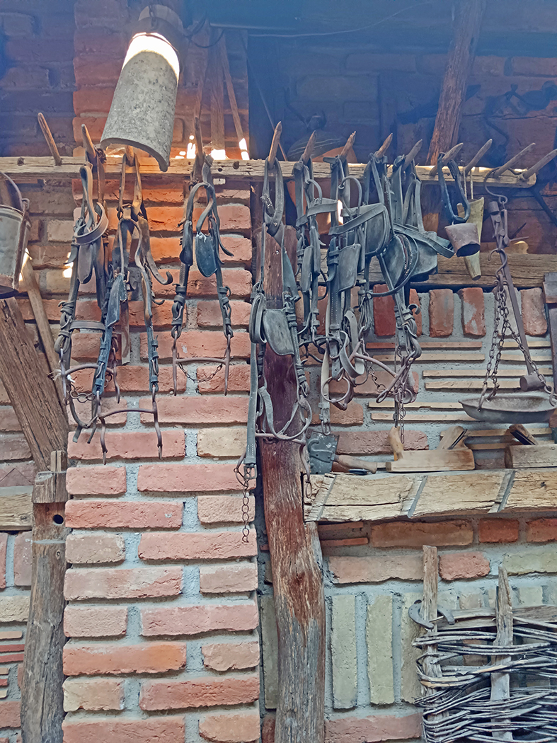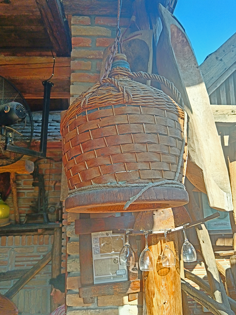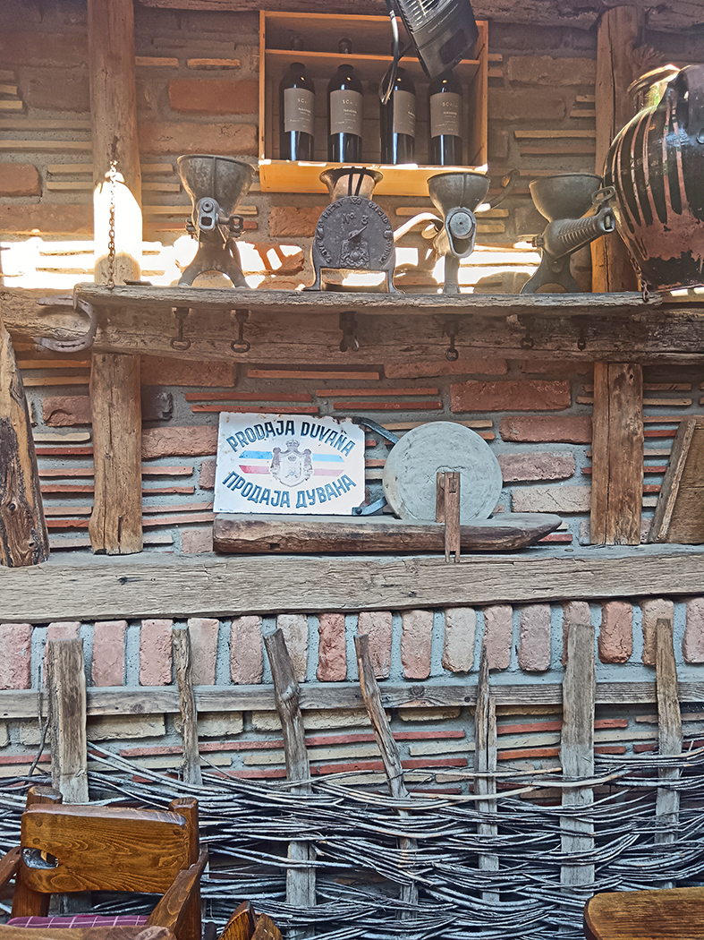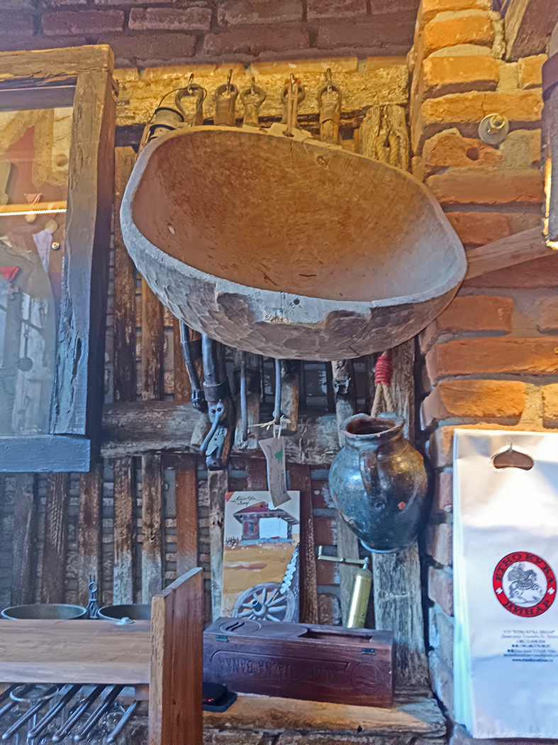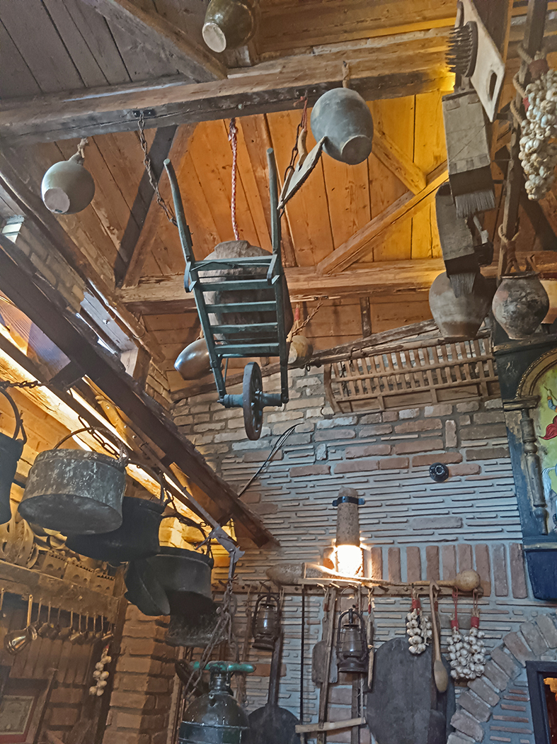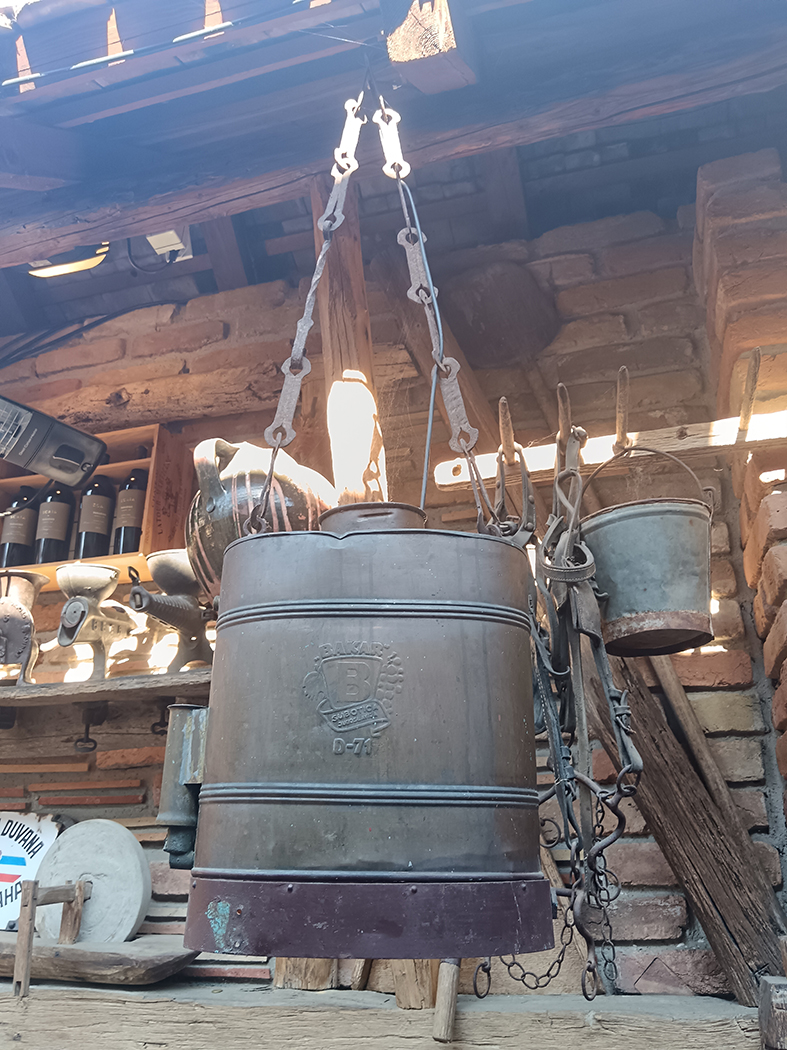 Dok ulazimo ne znam gde bih gledala, da li u plafon i na njemu okačena kolica, plugove, naćve, jasle, lustere od starih vrški, kanti i staklenih pletenih balona za vino i rakiju, kantare ili u zidove na kojima su negdašnji plotovi, lopari za hleb, fenjeri, drvene kutlače, venci belog luka, stare kofe, amovi, ćupovi, testere, nema čega nema. Što više gledam, to manje mogu da popamtim šta sve u par minuta videh.