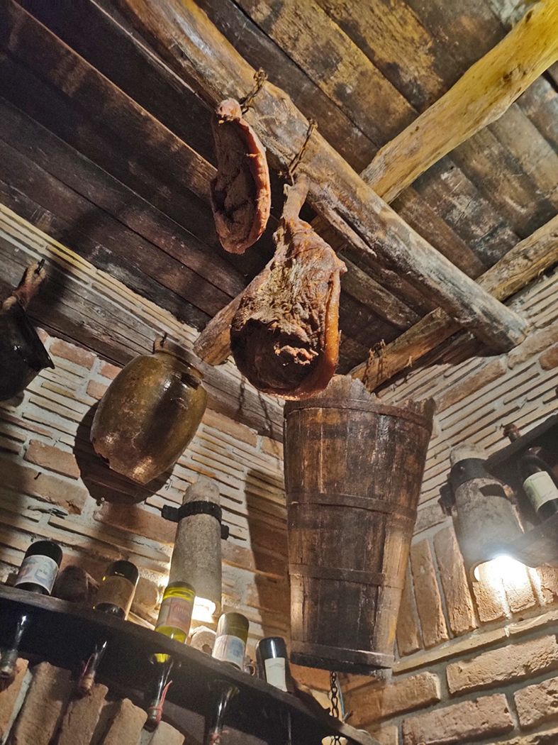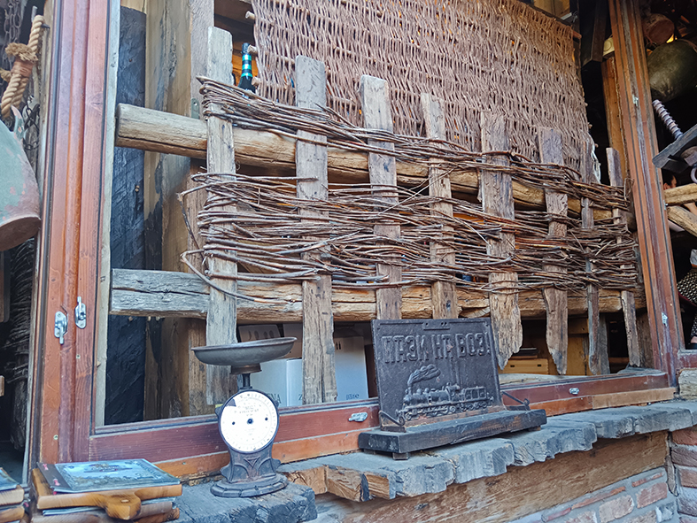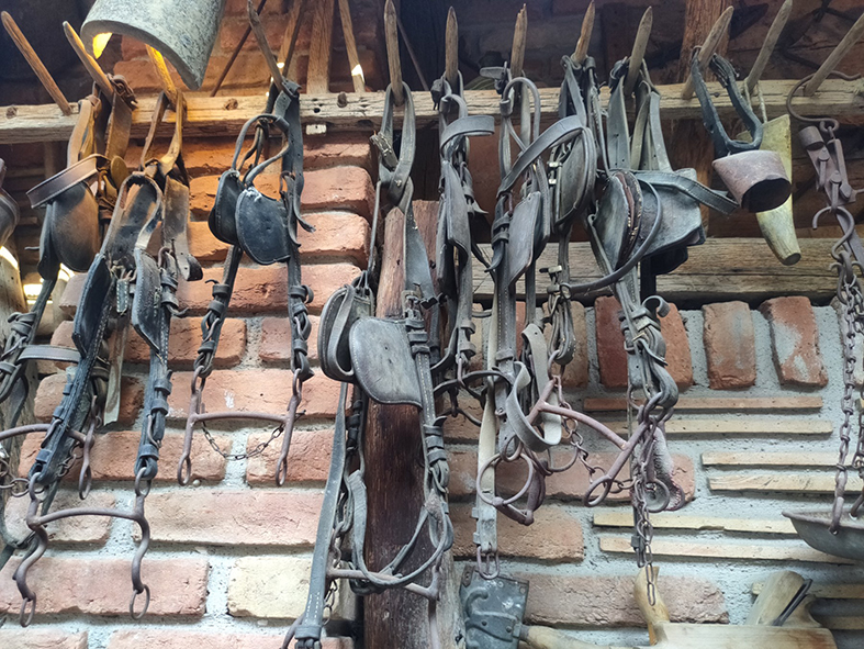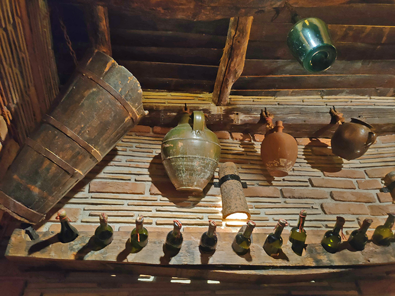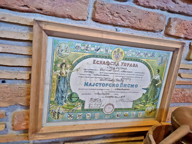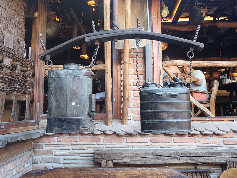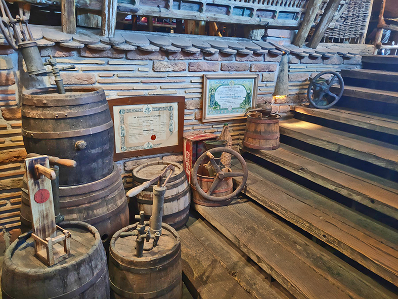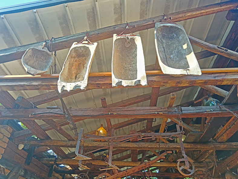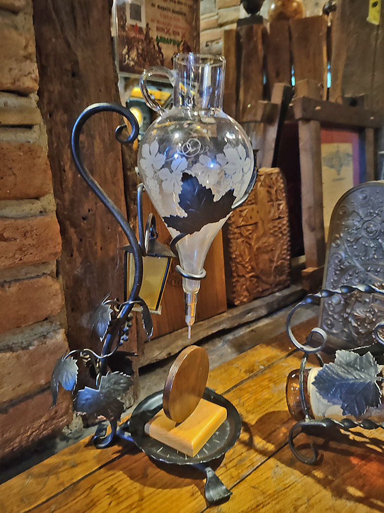 Dok ulazimo ne znam gde bih gledala, da li u plafon i na njemu okačena kolica, plugove, naćve, jasle, lustere od starih vrški, kanti i staklenih pletenih balona za vino i rakiju, kantare ili u zidove na kojima su negdašnji plotovi, lopari za hleb, fenjeri, drvene kutlače, venci belog luka, stare kofe, amovi, ćupovi, testere, nema čega nema. Što više gledam, to manje mogu da popamtim šta sve u par minuta videh.