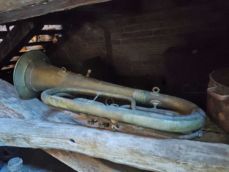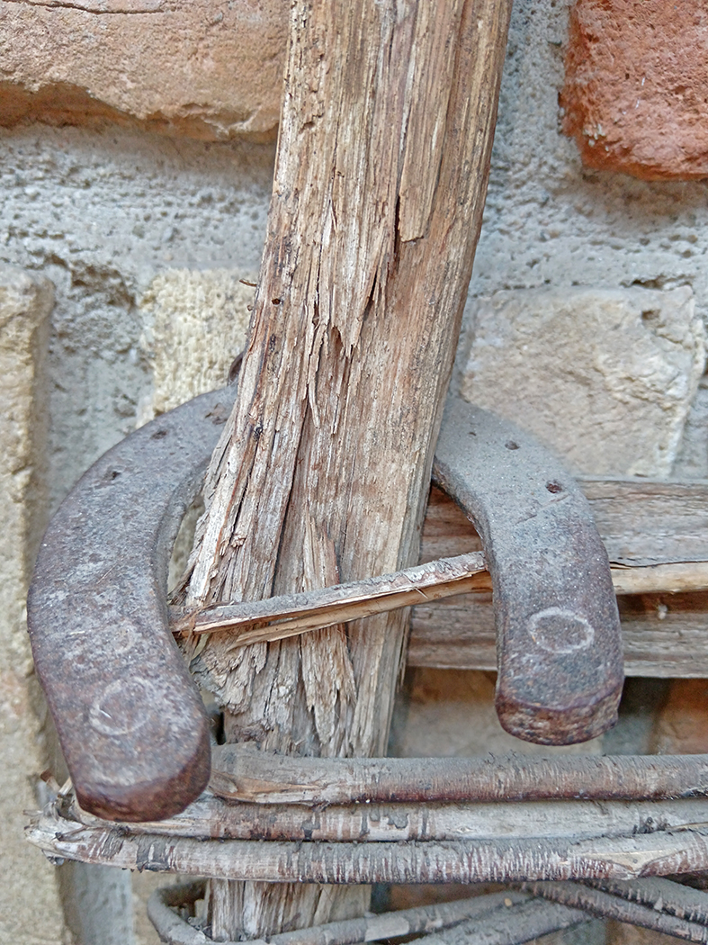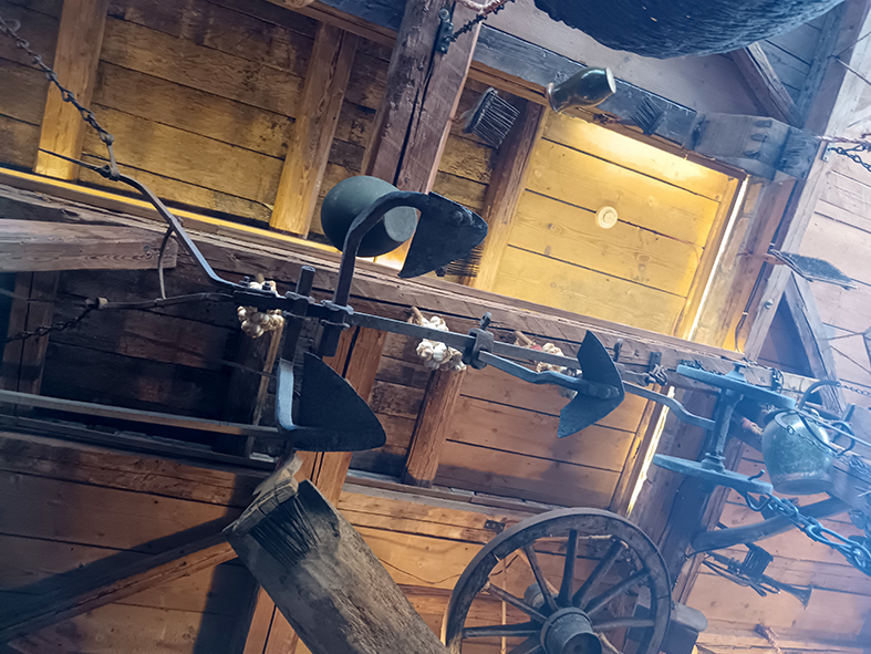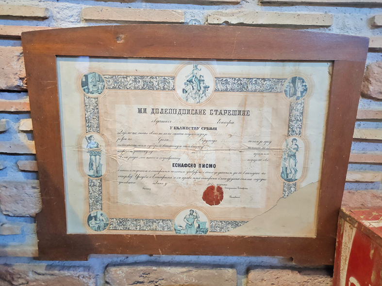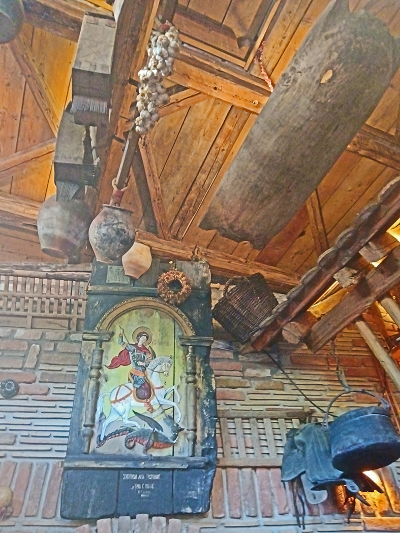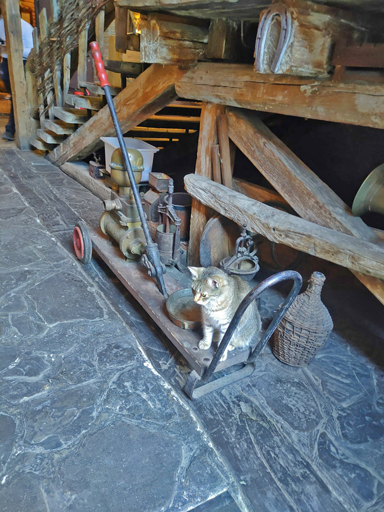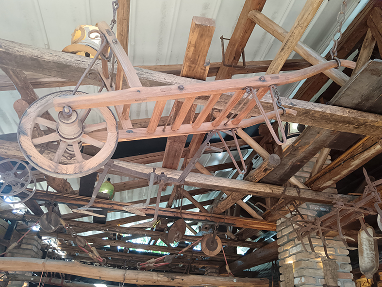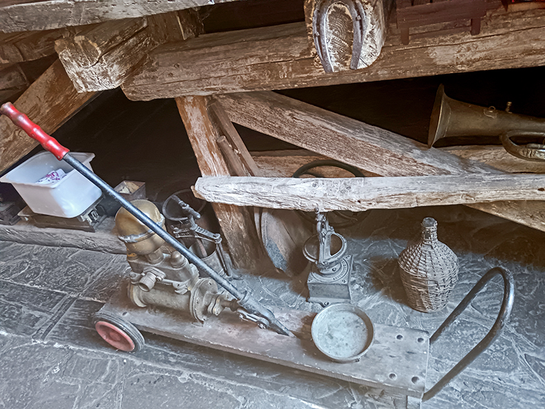 Dok ulazimo ne znam gde bih gledala, da li u plafon i na njemu okačena kolica, plugove, naćve, jasle, lustere od starih vrški, kanti i staklenih pletenih balona za vino i rakiju, kantare ili u zidove na kojima su negdašnji plotovi, lopari za hleb, fenjeri, drvene kutlače, venci belog luka, stare kofe, amovi, ćupovi, testere, nema čega nema. Što više gledam, to manje mogu da popamtim šta sve u par minuta videh.