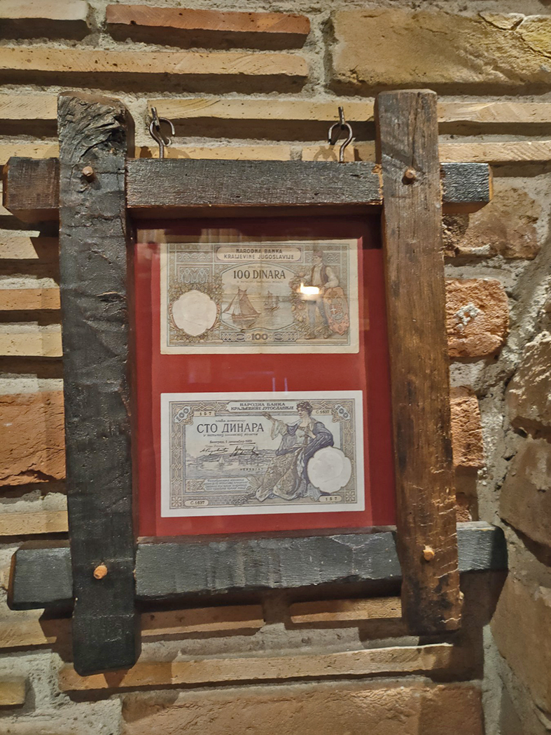 – Zašto? Pa, nacionalna valuta. U celom restoranu imamo dosta starih novčanica, sve što se radi je za dinar, čak smo i u susednoj Rumuniji u Temišvaru otvorili restoran koji se isto tako zove – osim uramljenih slika dinara, raznih sertifikata i esnafskih pisama, tu je i kasa, najstariji eksponat u restoranu.