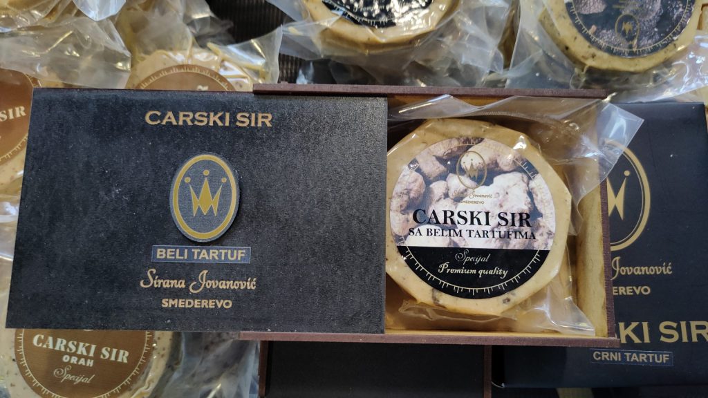 – U sir sa tartufima ne stavljamo prah, već sveže tartufe. I tu postoji razlika u odnosu na postojeće sireve sa tartufima. Mi dodajemo deset posto crnog tartufa i šest posto belog tartufa u sireve i to je zaista tako, nema prevare, nema ulja tartufa ili tartufata. Još jedan od neobičnijih sireva je i sir sa šavranom, a tu su i sir u belom i u crnom vinu – nabraja Jovanović, ostavljajući nedoumicu koji sir probati, kupiti, jer i po izgledu, pakovanju i po prezentaciji, zaista su „Carski sirevi“.