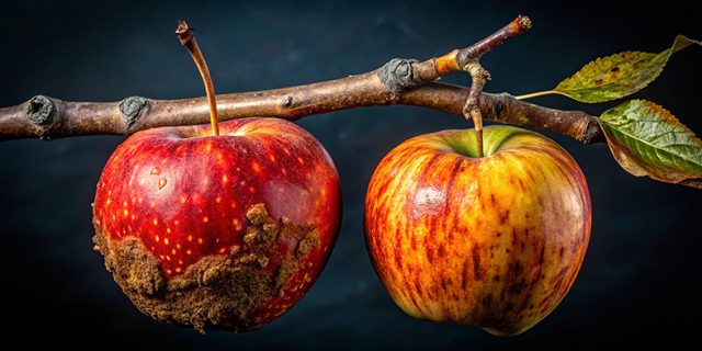 Jabuke mogu biti inficirane od trenutka zametanja pa do potpune zrelosti, ali i kasnije, posle berbe, u toku transporta i skladištenja. Mladi plodovi skoro po pravilu budu zaraženi preko sasušenih prašnika koji se na njima zadržavaju duže vreme. Zaraza može nastati i kroz pokožicu ploda, ako je pokožica i najmanje oštećena. Ove povrede najčešće nanose insekti, a mogu nastati i kao posledica delovanja hemikalija, insolacije, grada i slično.