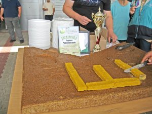 Ovaj tradicionalni delikates izliven je u obliku amblema Šumadija sajma. Tako je oblik šajkače bio od crvenog kukuruza, a slovo Š, od žutog projinog brašna.