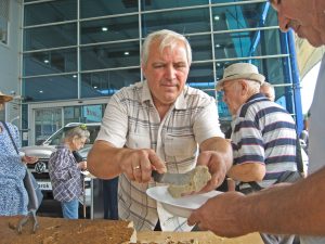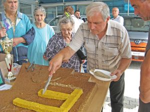 – Napravili smo ga od 65 litara vode i 48 kilograma brašna. Stavili smo 750 grama soli i litar ipo hladno ceđenog, suncokretovog ulja. Kačmak smo kuvali moja dva sina i ja, jedan sat i 20 minuta na otvorenoj vatri. Smesu smo mešali sve vreme, drvenom varjačom od skoro metar ipo, tako da je za taj posao potreban neko ko ima dobru kondiciju. Izlivali smo ga nas četvorica – kaže Radiša.