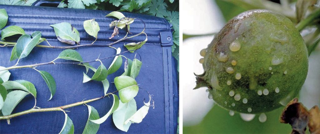 Voćari su poslali slike sa simptomima na dunji, kruški i jabuci, a posebno vikendaši sa pojavom „pastirske palice“ mladara na kruški. (sl.1). Vršni deo pocrni i crnilo se spušta na dole. Na plodovima se mogu pojaviti karakteristični eksudati, a radi se o bakteriozi pod imenom Erwinia amylovora.