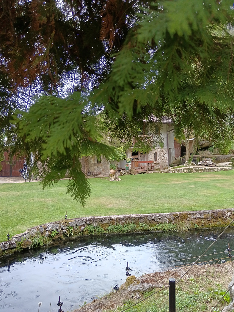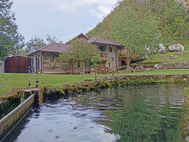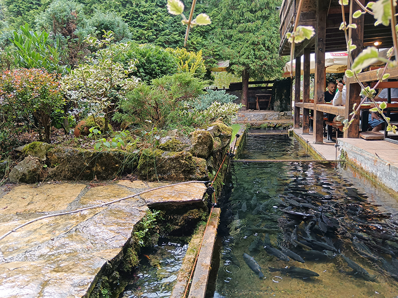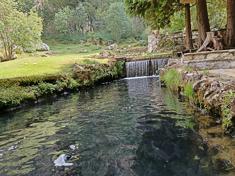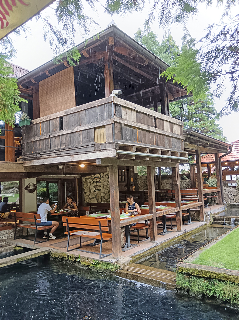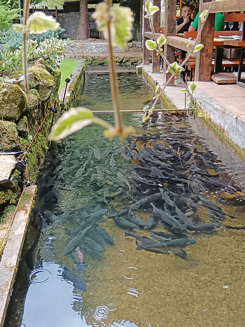 A restoran, e on je posebna priča. Ispod same Potpećke pećine, s pogledom uz koji biste se budili svako jutro. Kad uđete, prođete s leve i desne strane pored stolova, nekih desetak koraka možda, nailazite na ribnjak pun pastrmke koja se praćaka. I ceo kompleks je na ribnjacima, čak i ispod samog restorana protiče reka koja izvire ispod pećine i prolazi kroz selo. Gde god krenete pogledom svuda nestvarno zelenilo, voda i u vodi riba zbog koje ovde dolazi dobar deo Srbije, a i šire. Jedino u ovom restoranu u Srbiji, bar po mom sećanju, možete pojesti riblju supu, od čistog mesa pastrmke i najlepšu pitu od suvih šljiva, zbog koje smo u načelu i došle. Dok je stigla naručena kafa, domaćinska, jaka, i već pomenuta pita, krenula je i kiša. Ona sitna, letnja, tek da poprska, da spere prašinu i da olakša, da se diše. Gledam tu igru kapi, kuckam poruke sa prijateljem i pišem kako ću u pećinu.