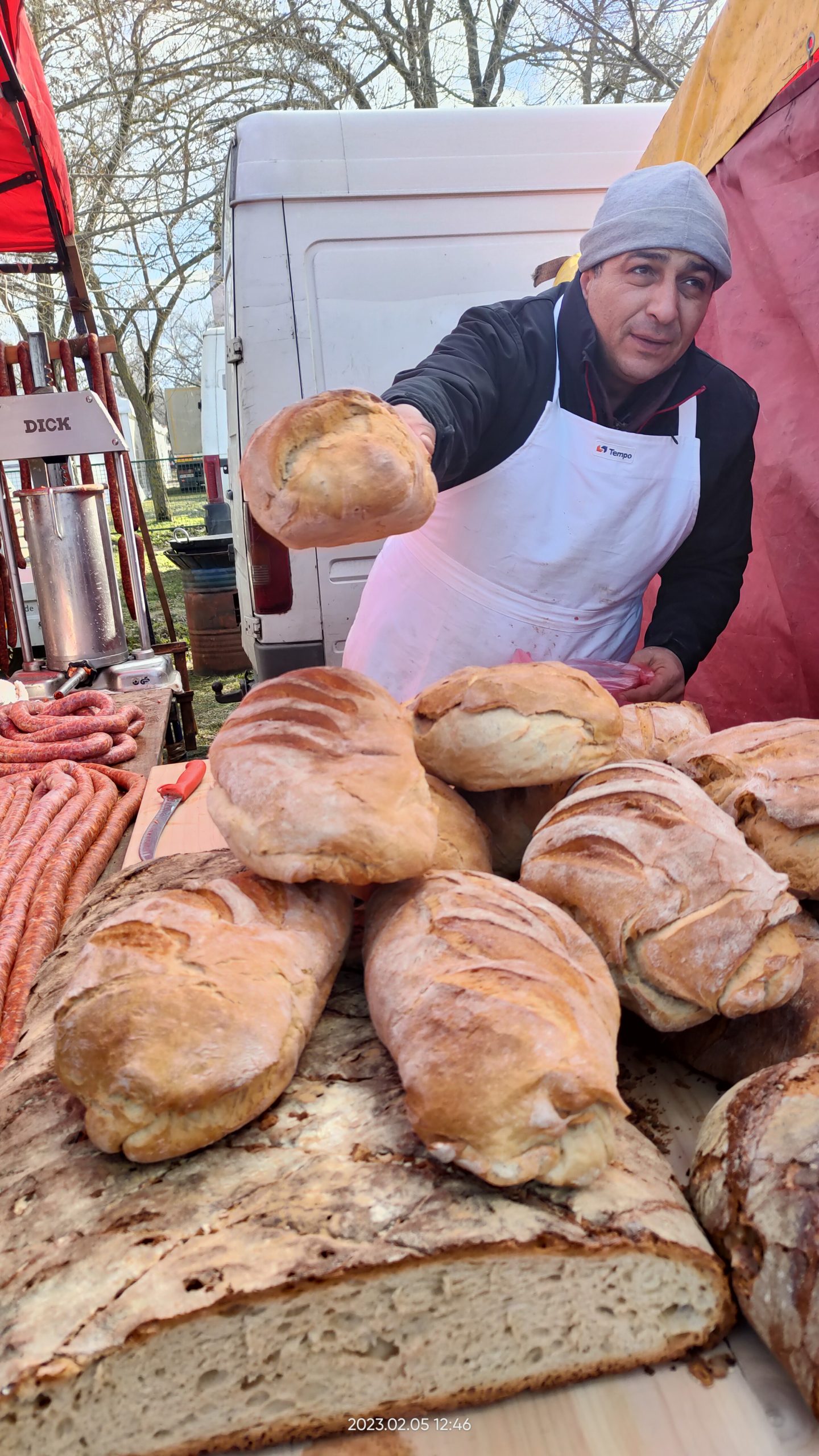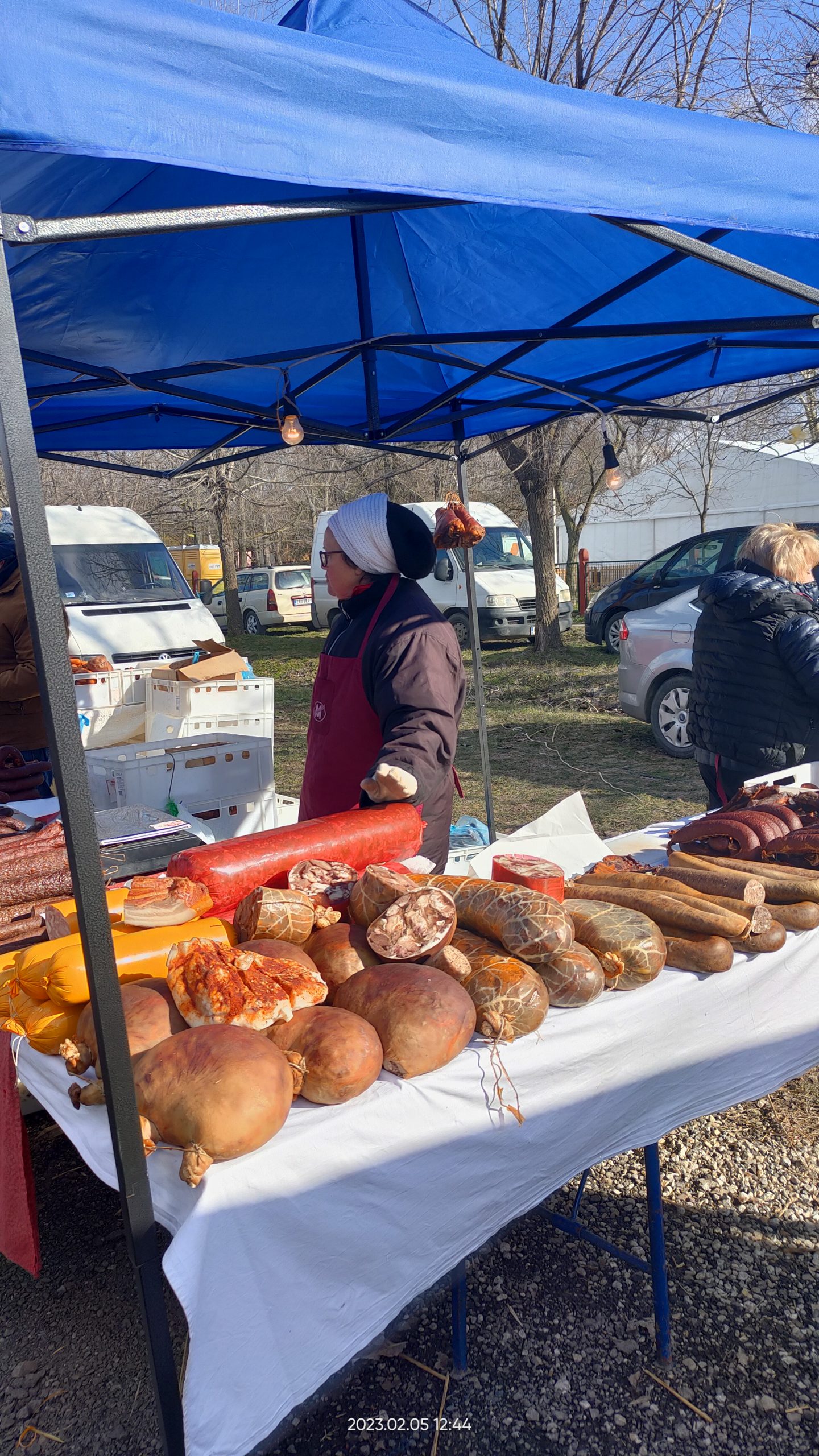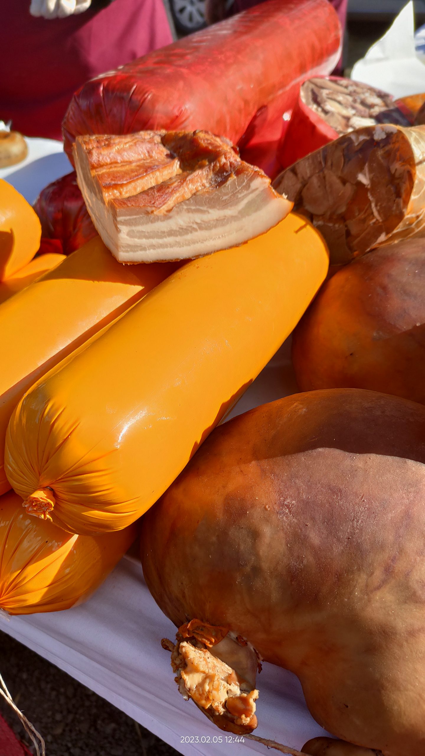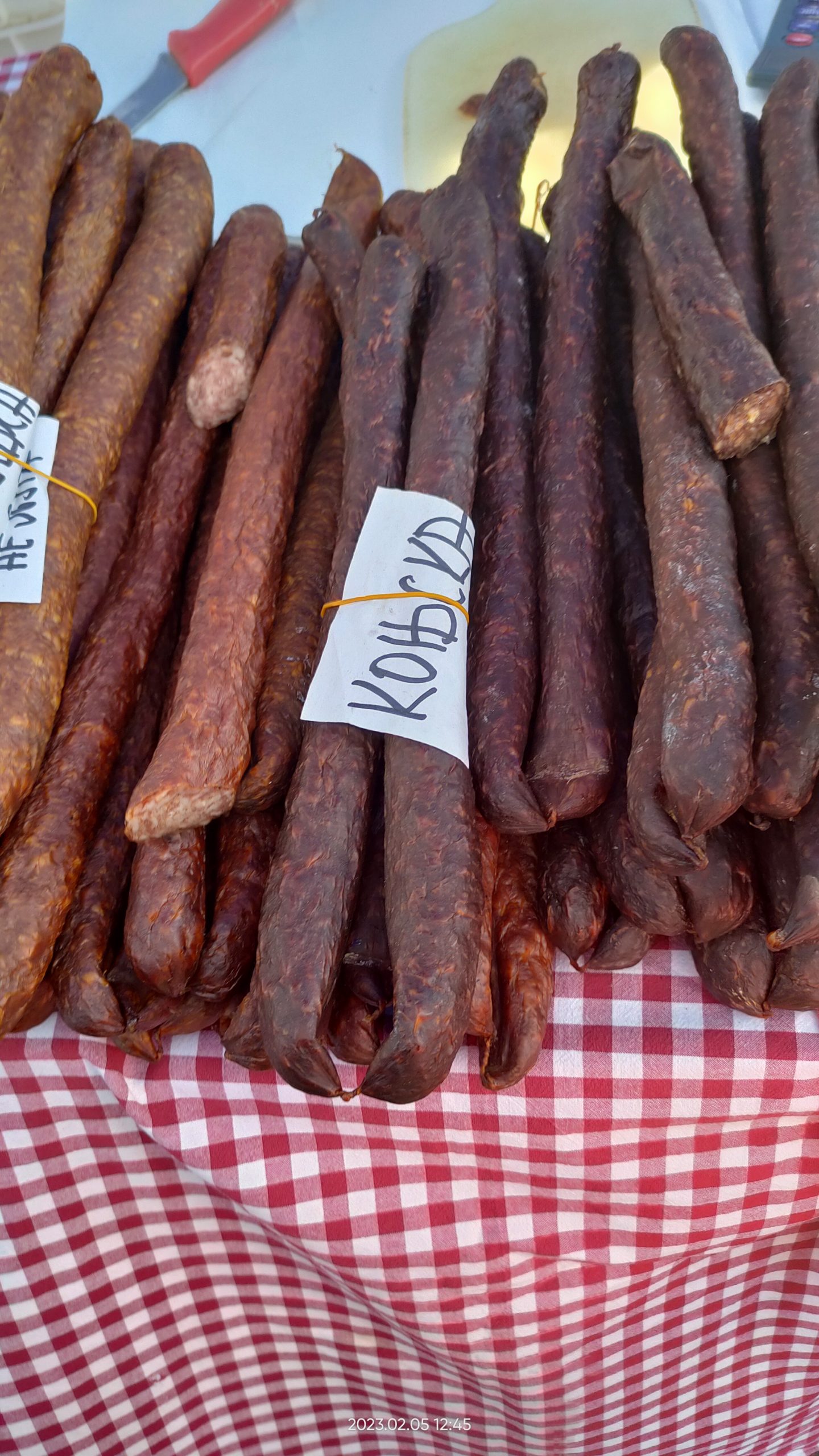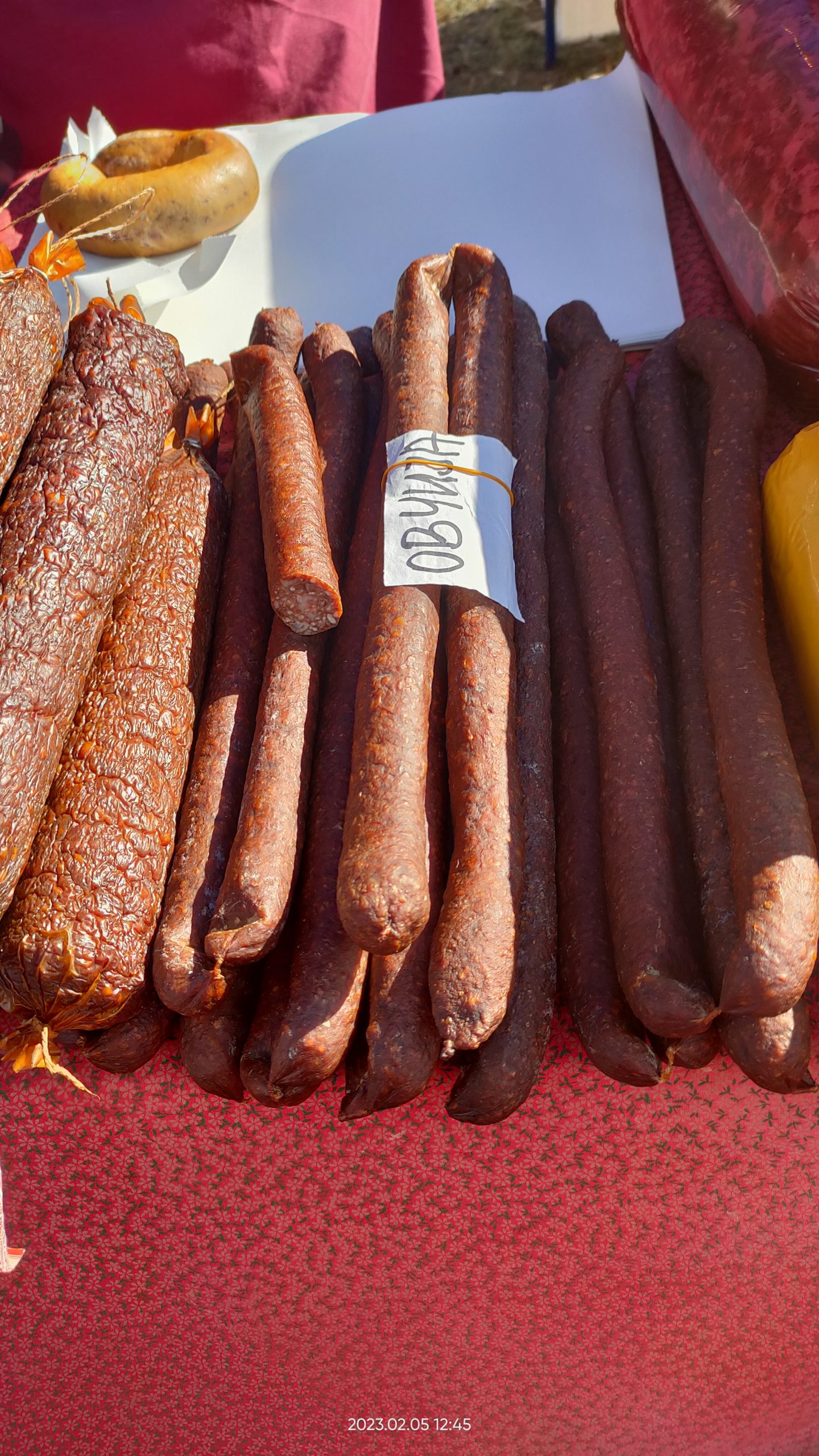 Par mesta dalje sveži „juče prženi čvarci“, oni krupni masni što ršte pod zubima, duvan čvarci ne zna se kad spremljeni po pristojnoj ceni od 1400 dinara, tanke kobasice, salama u biberu – ooooodlična, kulen u crevu, dobro suva ne kuvana već dimljena slanina, i još trista čudesa od mesa. I gužva oko improvizovane tezge, naravno.