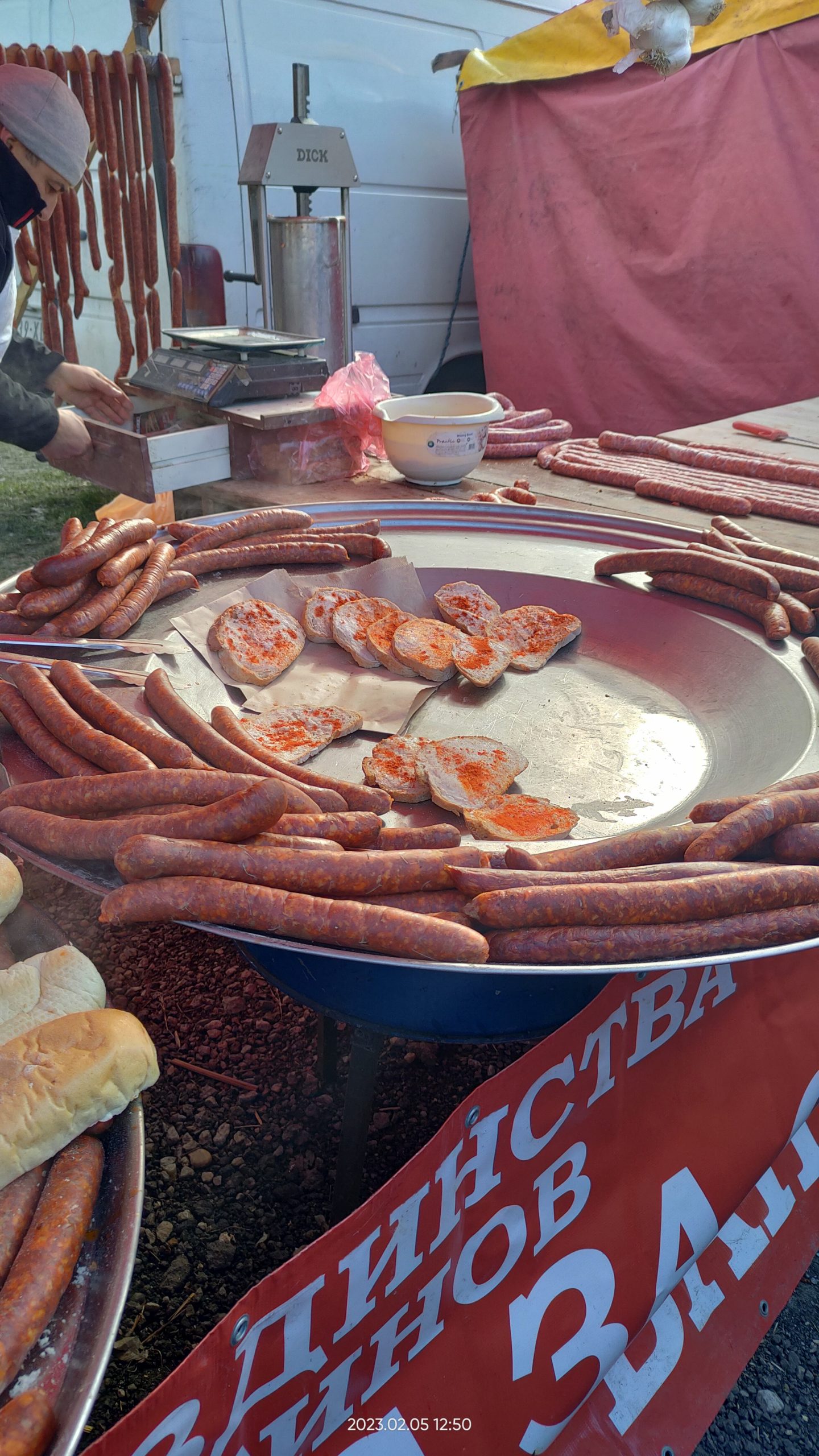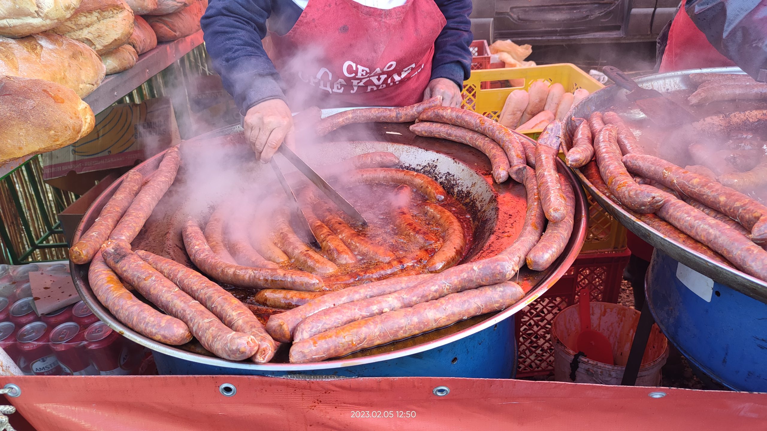 Dok se u šatoru mezetilo, prava hrana, ono što se jedva čekalo bilo je napolju, na tezgama. Na talandarama gusto naređanim, u masti, cvrčale su prodimljene i sveže kobasice. Već uigrana ekipa prima porudžbine, seče domaće somune koje biste i prazne sa slašću jeli, stavlja vrele na početku slane a tek posle nekoliko zalogaja osetite ljutkaste kobasice i naplaćuje trista dinara. Realno nije strašno za količinu hrane koju dobijete, pa je i gužva na tezgi bila poprilična.