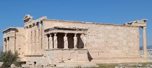 Akropolj znači „visoki grad” i bio je srce drevne Atine. Najslavniji je po Parternonu, hramu posvećenom boginji Atini, zaštitnici grada. Izgrađen u 5. veku pre nove ere tokom Periklove vladavine, Parternon simbolizuje zlatno doba Atine, procvat umetnosti, demokratije i filozofije. Odmah pored je i Erehtejon, hram poznat po karijatidama – ženskim figurama koje zamenjuju stubove. Ovde se, prema legendi, odigrao mitski dvoboj između Atine i Posejdona za prevlast nad gradom. Atinina maslina pobedila je Posejdonovu vodu i tako je grad dobio ime.