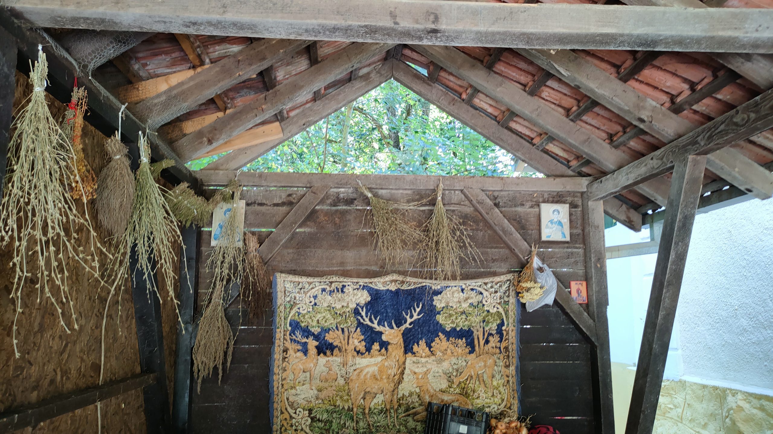 Prekidajući priču monahinja nas upućuje na proplanak iznad manastira, na kome se između desetletnih stabala na čistini nalaze štala i obori.