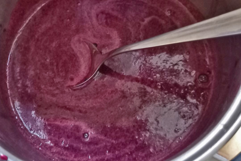 Za marmeladu smo u secku, a može i u blenderu, usitnili grožđe, a potom ga procedili kroz cediljku u kojoj su se zadržale ljuskice i zrnca. Dobijenoj kaši potrebno je dodati taman onoliko šećera ili meda, samo ako je grožđe kiselkastije nego što volimo. Kuvati na tihoj vatri uz povremeno mešanje. Pri kraju dodati malo limunovog soka.