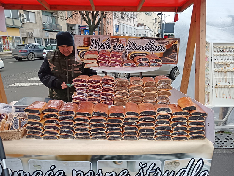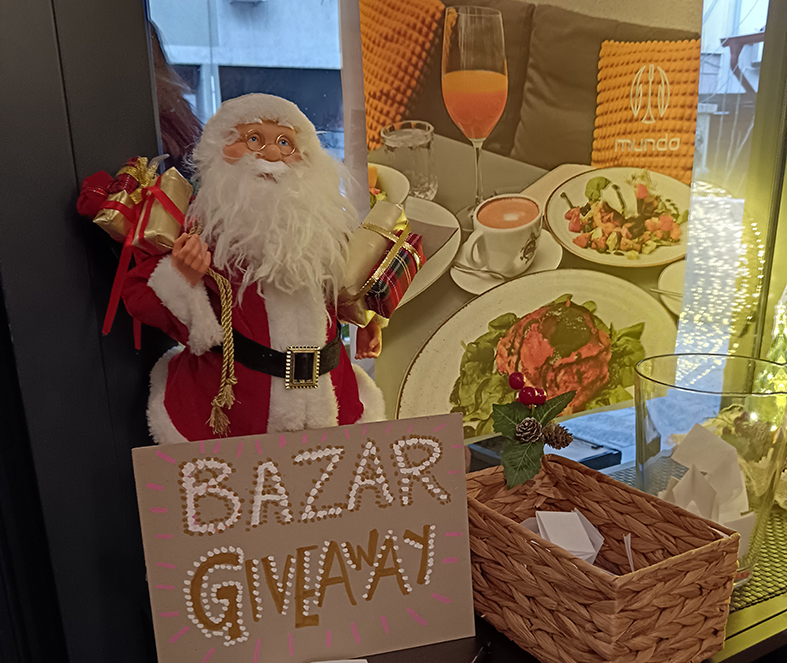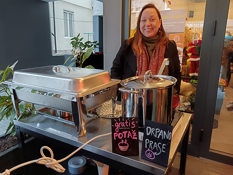 -Imamo još dve subote – 20. i 27. decembra, u periodu od 11 do 15 časova. Nazvali smo ih Praznična druženja u “Mundu”. Razmišljali smo da li i kako da nešto organizujemo. Ideja je bila da se spoje hrana, druženje i praznična atmosfera.Smislili smo da ponudimo degustaciju, svake subote drugi potaž. Danas imamo potaž od bundeve i drpano prase kao degustaciju. Drpano prase je prasetina, tačnije krtina od prasetine koja se kuvala pet sati. Služimo je sa klicama i domaćim hlebom koji ovde pravimo – otkriva Ivana.