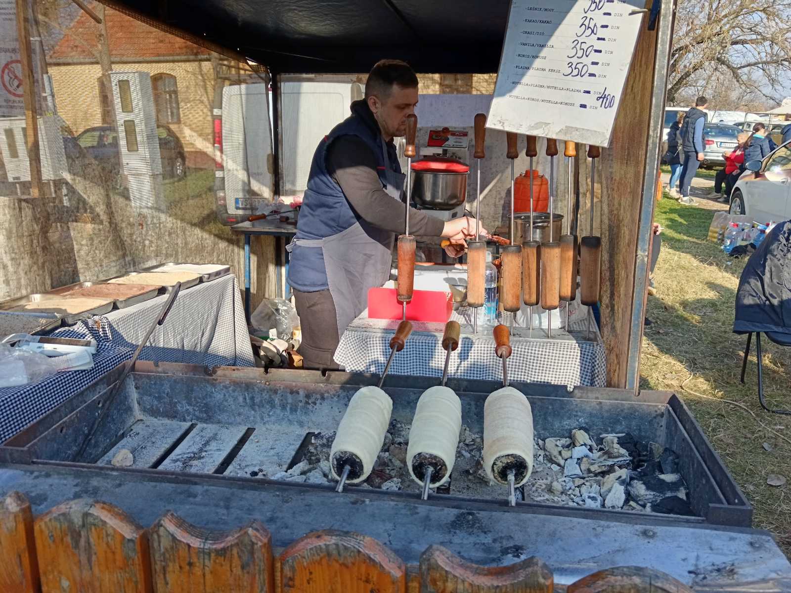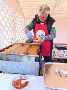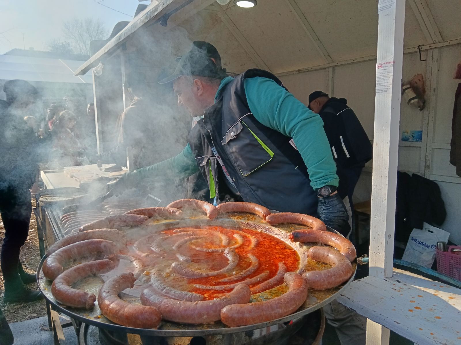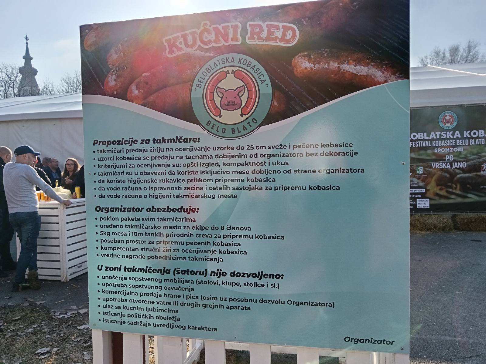 Na samom prilasku, preko puta belog šatora u kome se svake godine održava takmičenje u pravljenju kobasica, okreću vola na ražnju. Bar ono što je od njega ostalo. I nije mi jasno, ako smo mi došli oko jedan popodne, ko je do ta doba već uspeo da izede veći deo vola.