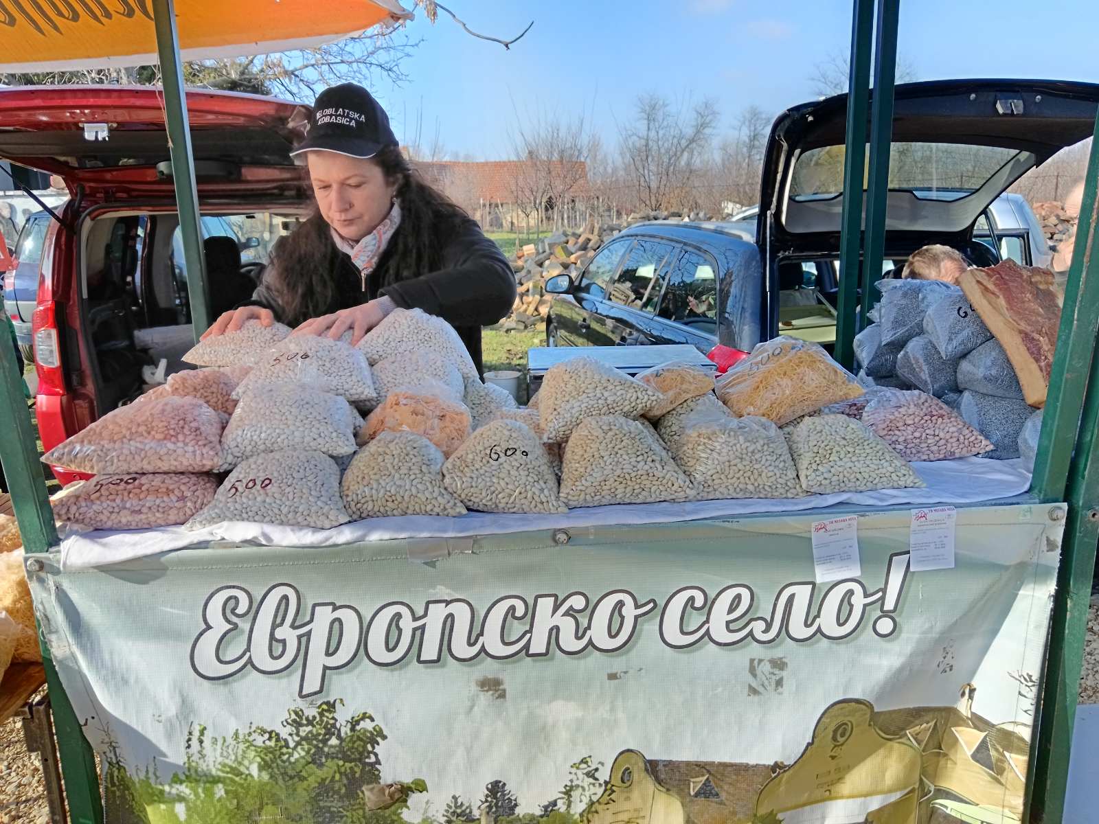U kifli ili tortilji, kako vam volja. Sveže od 1000 do 1200 dinara za kilogram, prave i na licu mesta. Mi, međutim, ne kupismo kobasice, nama su se svideli sirevi. Ementaler jeftiniji nego u megamarketima, o ukusu ne bih raspravljala.