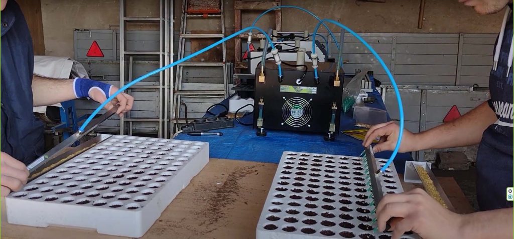 – Prese takođe prave ležište za semena, kako bi sva bila posejana na istu dubinu. Tu su još i izbijači presadnica koji služe za izbijanje rasada, kako se ne bi oštetio korenov sistem, što se dešava kada se biljka uhvati za stablo i vuče iz kontejnera. To je, na primer, najveći problem kod paprike kada se seje u stiroporni kontejner. U planu nam je još proizvodnja mašina za punjenje kontejnera supstratom i mašina za postavljanje malč folije – otkrio nam je Petar Lazić planove za budućenost.