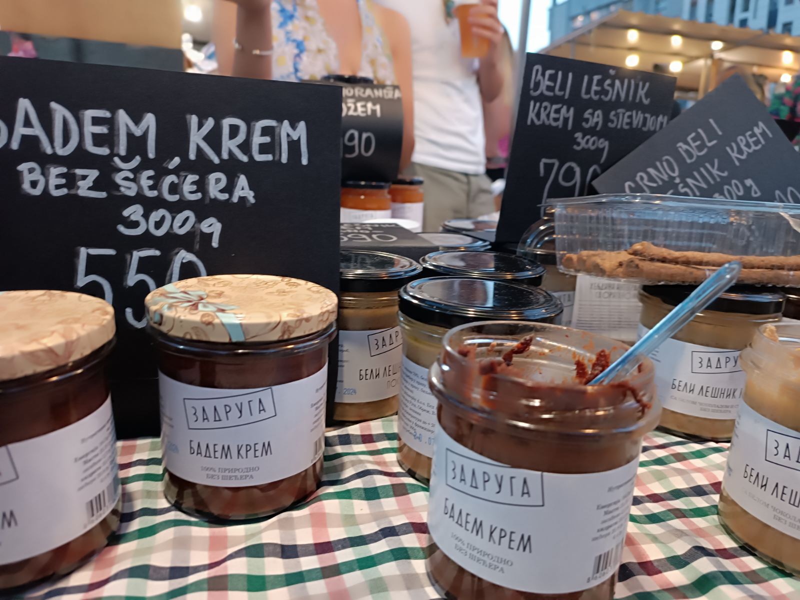 Uz njih da zamezite, da vas ne uhvati čašica, mezetluci, francuski sirevi, ajvar ljuti i blagi, namazi slatki i slani, ši buteri i da se zasladite a da ne brinete o kilaži i šećeru dijetalni kolači na kraju.  Ovoga puta, međutim, najviše je bilo proizvođača rukotvorina, nakita, odevnih predmeta, kozmetike.