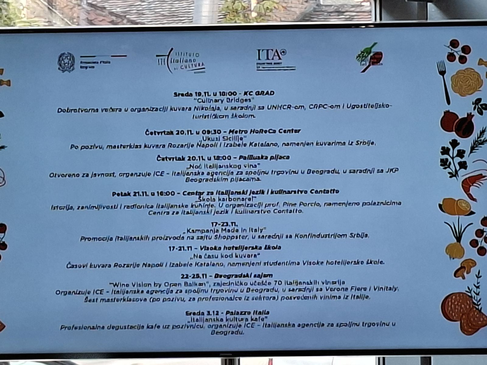 Na Palilulskoj pijaci, u Beogradu, održana je konferencija za novinare na kojoj je predstavljen program desetog izdanja Nedelje italijanske kuhinje u svetu. Tema ovogodišnje nedelje italijanske kuhinje u Srbiji je „Italijanska kuhinja između kulture, zdravlja i inovacija“. Bogat program očekuje sve posetioce od 17. do 23. novembra, na kome će biti predstavljen identitet, društvena i ekonomska vrednost italijanske kulinarske tradicije.