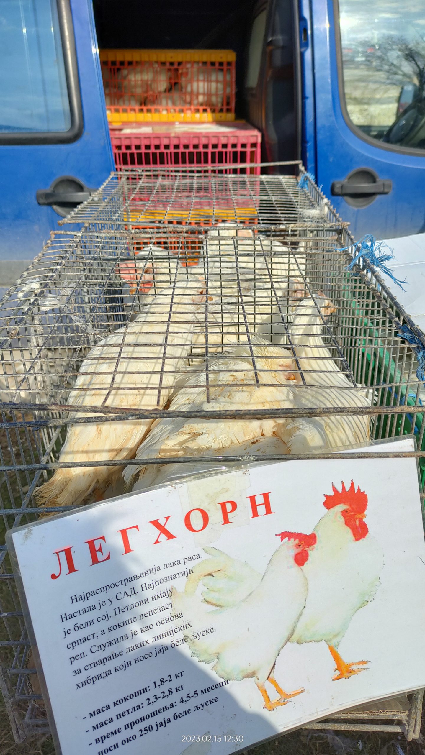 Pilići tovni, kako prodavci kažu, domaći, ne oni iz inkubatora, nagurani u gajbe, pokriveni kartonom da se ne prehlade, čekaju svoje kupce. Cena po piletu je 300 dinara, sem brame koja je 450 i po broju, reklo bi se, najkraće čeka kupce.
