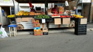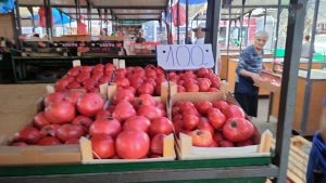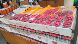 Ono što na tezgama obitava kreće se u rasponu od 180 dinara za šeftelije, 150 do 200 dinara za kornišone, paradajz od 100, 180 do 250 dinara, beli luk tri glavice za 100 dinara, paprika je 180 – 250 dinara, crni luk – kolačar 150, 170 -200; crni luk, što bi rekli kineski je 130, karfiol 250, pečurke 350, grožđe od 180 do 300 u zavisnosti od sorte, maline su za razliku od otkupne cene kojom su svi nezadovoljni čitavih 800 dinara po kilogramu, koren celera je 120, dok je veza zeleni 150 dinara. Ukoliko volite kajmak potrebno je da izdvojite 1200 dinara što je na nivou cena u prodavnicama, dok cena jaja već mesecima ne mrda i kreće se od 16 do 25 dinara.