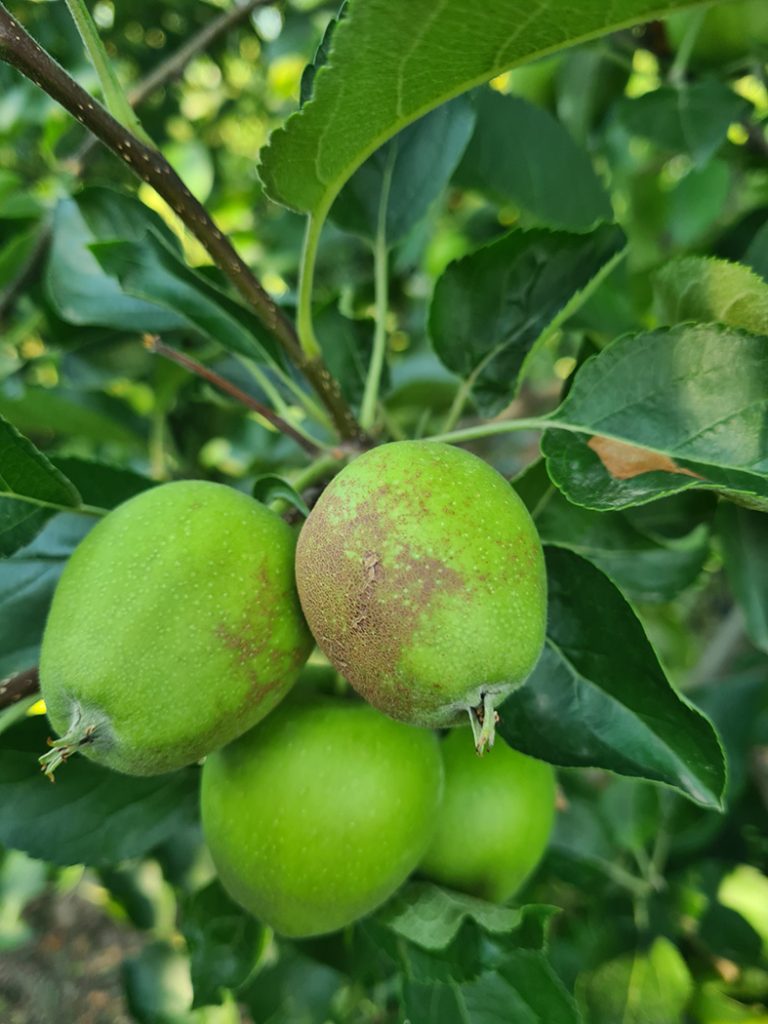 Oštećenje plodova, tj. pojavu rđaste prevlake, mogu da izazovu ekološki uslovi sredine (vlažnost vazduha, kiša, mraz, sunčeva svetlost), patogeni, insekti, pesticidi. Do oštećenja pokožice može doći i mehaničkim putem. Pepelnica jabuke (Podosphaera leucotricha) može dovesti do pojave rđaste prevlake.