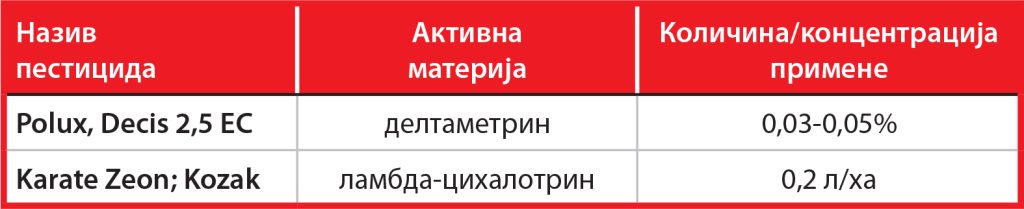 Ukoliko se u zasadima leske uoči prisustvo gore pomenutih štetočina preporučuje se sprovođenje mera zaštite primenom jednog od registrovanih insekticida: