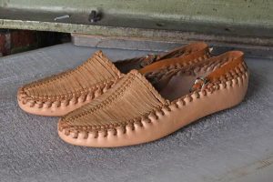 – Prvo se po šablonu skroje đonovi i lice. Đonovi se potope u vodu kako bi omekšali da bismo ih lakše formirali. Šilom se izbuše rupe kuda ćemo provlačiti inpregrirani konac. Onda ušivamo komad kože napred i na peti. Sve se stavi na kalup i onda se šije lice i đon zajedno, tako što se sa strane zateže konac da dobije oblik kalupa. Gornji deo se sastoji od jednog srednjeg i dva poprečna kaiša i luba. Kroz lub se provlači kaiš kojim se zakopčava opanak – otkriva naš sagovornik.