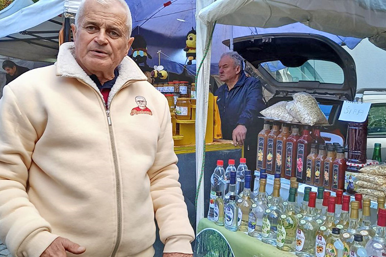 – Mušterijama je interesatna rakija od bundeve. Hoće da je kupe, nose je i za poklon. Bundeva je sama po sebi zdrava, ne prska se. A rakija se pravi kao i svaka druga. Isecakamo bundevu na komade, onda je meljemo, stavljamo u burad. Kad provri pečemo je. Ali mora da se pazi kod pečenja da ne bude nagla vatra. Nekima ova rakija odgovara, nekima ne, kao i kod svake rakije. Svako bira prema svom ukusu. Ali ne desi se da neko ne zastane, bar da pogleda – kaže Silvester Ruskovski.