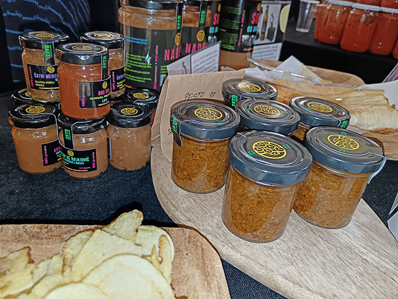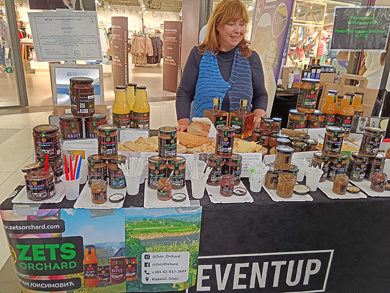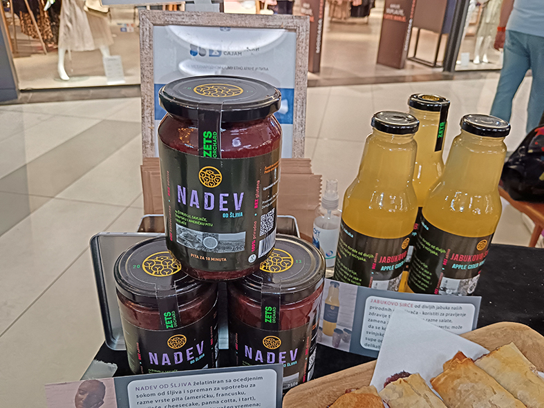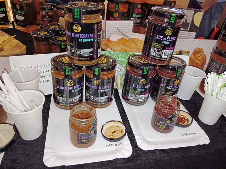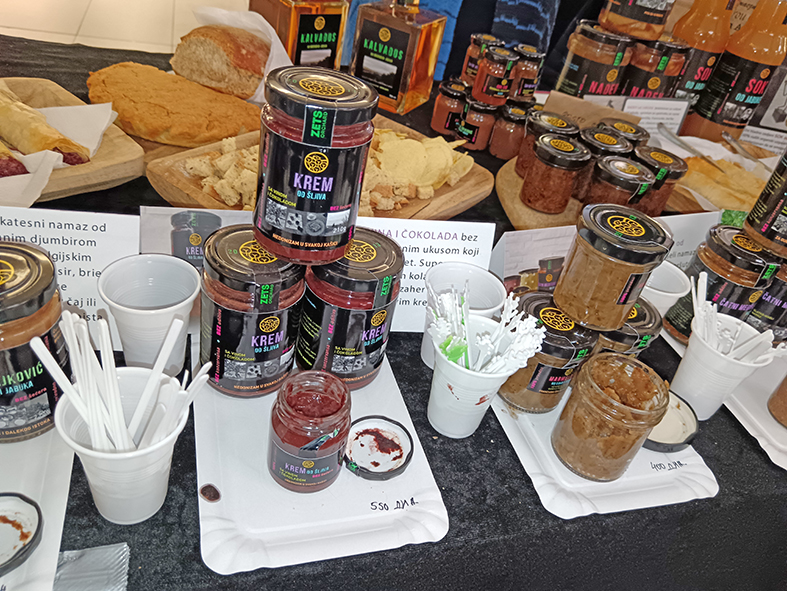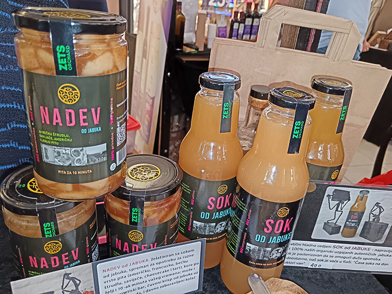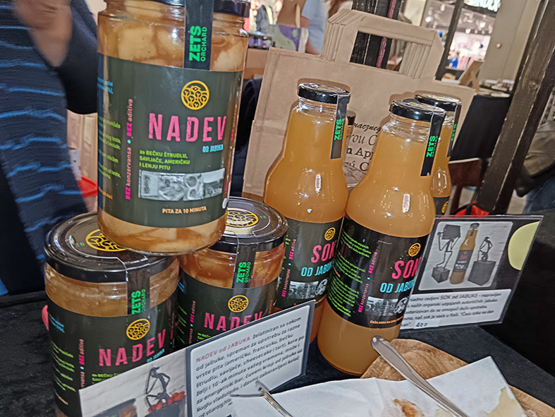 – Na paleti imamo slatku selekciju Zets Orchard, bez šećera. Krem od šljiva sa vinom i gorkom čokoladom, a vino merlo kupujemo iz lokalne proizvodnje. Takođe imamo sirup de Rajković, koji je po ugledu na sirup de Liège, sada zaštitni znak sela Rajković, gde se mi nalazimo, i koji je od krušaka, jabuka i đumbira. Svi namazi džema po nomenklaturi moraju da imaju 60 odsto šećera. Pošto mi nemamo te šećere, dodajemo eventualno žuti ,koji imamo samo jedan odsto u jednom proizvodu. Znači akcenat je na slasti našeg voća, jer ga beremo kad je zrelo. Voće putuje 100 metara od voćaka do proizvodnje. Znači, on je, recimo, preliv za kamember sir, a može se, naravno, staviti i preko  vanilica, krofnica, princes krofnica. Zaštitni simbol je aromatični namaz od jabuka, koji je u svetu poznat kao puter od jabuka, ali u Evropi ne može da se zove puter, jer nema putera u sebi. On je spreman od naših organskih jabuka, bez šećera. Ima specifičnu recepturu i u jednoj kašiki ima 20 kalorija – priča Martina Joksimović na čijoj dedovini se nalazi gazdinstvo Zorana Joksimovića.