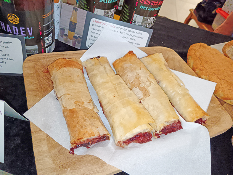Ona je ponosna i na nadeve od šljiva i od jabuka, koje od milošte zove “pita za deset minuta”, pošto je sve u tegli. Znači, domaćica izabere kore po želji. Da li će da rola tog dana ili će praviti američku pitu, ili švapsku pitu, ili francusku pitu ostaje na domaćici. Onda preko stavi nadev od šljive i jabuke po želji i peče. Naravno, imaju i sokove od jabuka, a to su matični i sveže ceđeni – ono što im je zaštitni znak je sirće, gde jednu flašu spremaju godinu dana.