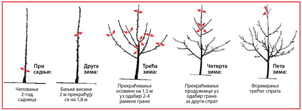 Vođica sadnice se orezuje na visinu od 1,80 do 2 m prilikom sadnje. Svake godine stožina se povratno prekraćuje za jednu trećinu rasta iz prethodne godine. Pinciranje prirasta sa zatvorenim uglovima koji se nalaze ispod produžnice u junu podstiče razvoj rodnih grana sa otvorenijim uglom.