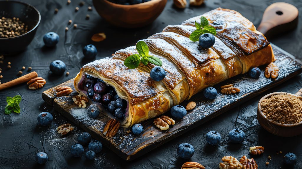 Za ovu pitu potrebno je pripremiti pola kilograma gotovih kora, oveći tanjir borovnica, ulje, šećer i vodu. Suva varijanta ove
