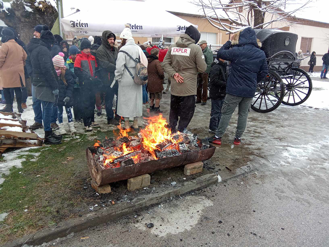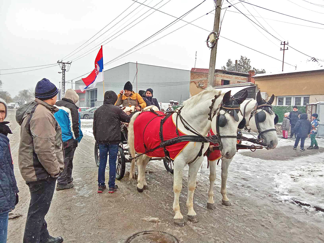 Sa pozdravom „Mir Božji, Hristos se rodi“, konjanici ulaze i u dvorišta komšija i prijatelja u kojima ima devojaka za udaju, a domaćini ih kite peškirima i poslužuju pićem i kolačima.