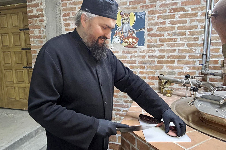 – Nabavljamo sašimi tunu. Sašimi inače znači proces obrade, odnosno sečenja ribe. Dobijamo je, dakle, već isečenu, odnosno filetiranu od leđnog dela, niz kičmu ribe. U tim komadima nema kostiju, jer se one nalaze uglavnom u trbušnom delu. Proces pravljenja počinje time što isečemo ribu na komade željene veličine i stavljamo ih u mešavinu začina, koje sami pravimo. Uglavnom su to domaći začini i mogu da se kombinuju kako kome odgovara. Potrebno je da začinjeni komadi odstoje 24 sata, a ako su veći onda i 48 sati. Nakon toga se kače u sušaru. Za sušenje koristimo bukovo drvo, ali nekoliko puta dodajemo i drvo osušenih šljiva – kaže iguman Onufrije i dalje objašnjava proces dobijanja sušene tune: