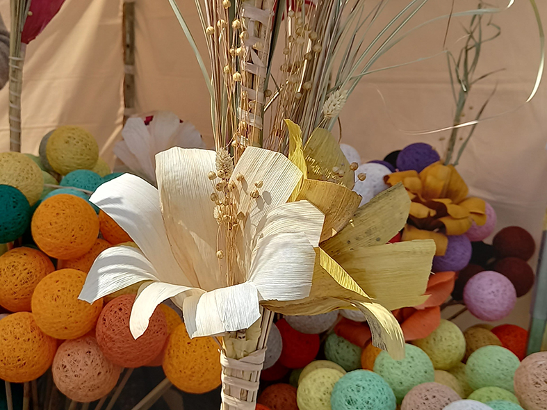- Kukuruzovinu ne sušimo, niti presujemo, već je odmah bojimo tekstilnim bojama, oblikujemo cvet po želji i potom se ukras suši. Dodajemo detalje od lana, čička, ili ukrasne travke. Zavisi od inspiracije. Posao je kreativan, odmara dušu – dodaje Slavoljub.