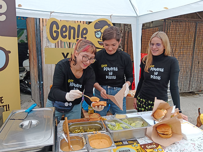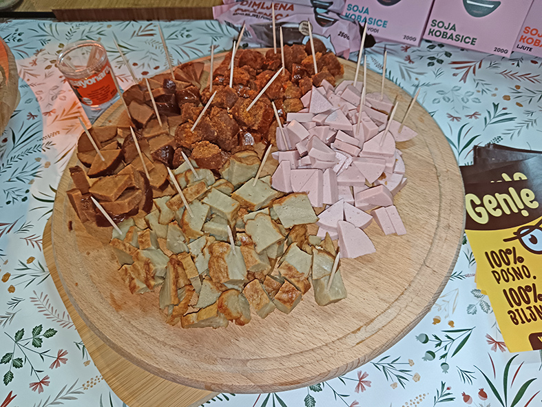 Od Tamare Jeftović koja je bila ispred pomenute firme, saznali smo da proizvode razne veganske delikatese, od veganske dimljene pečenice, preko milerama, soje kobasica, do tempeha i tofua. A što se tiče restoranskog štanda, tu nude veganski burger i veganski čizburger.